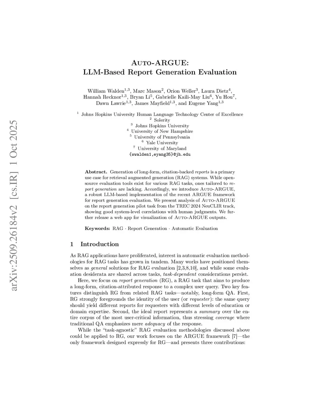 Generation of long-form, citation-backed reports is a primary use case for retrieval augmented generation (RAG) systems. While open-source evaluation tools exist for various RAG tasks, ones tailored to report generation (RG) are lacking. Accordingly, we introduce Auto-ARGUE, a robust LLM-based implementation of the recently proposed ARGUE framework for RG evaluation. We present analysis of Auto-ARGUE on the RG pilot task from the TREC 2024 NeuCLIR track, showing good system-level correlations with human judgments. We further release a web app for visualization of Auto-ARGUE outputs.