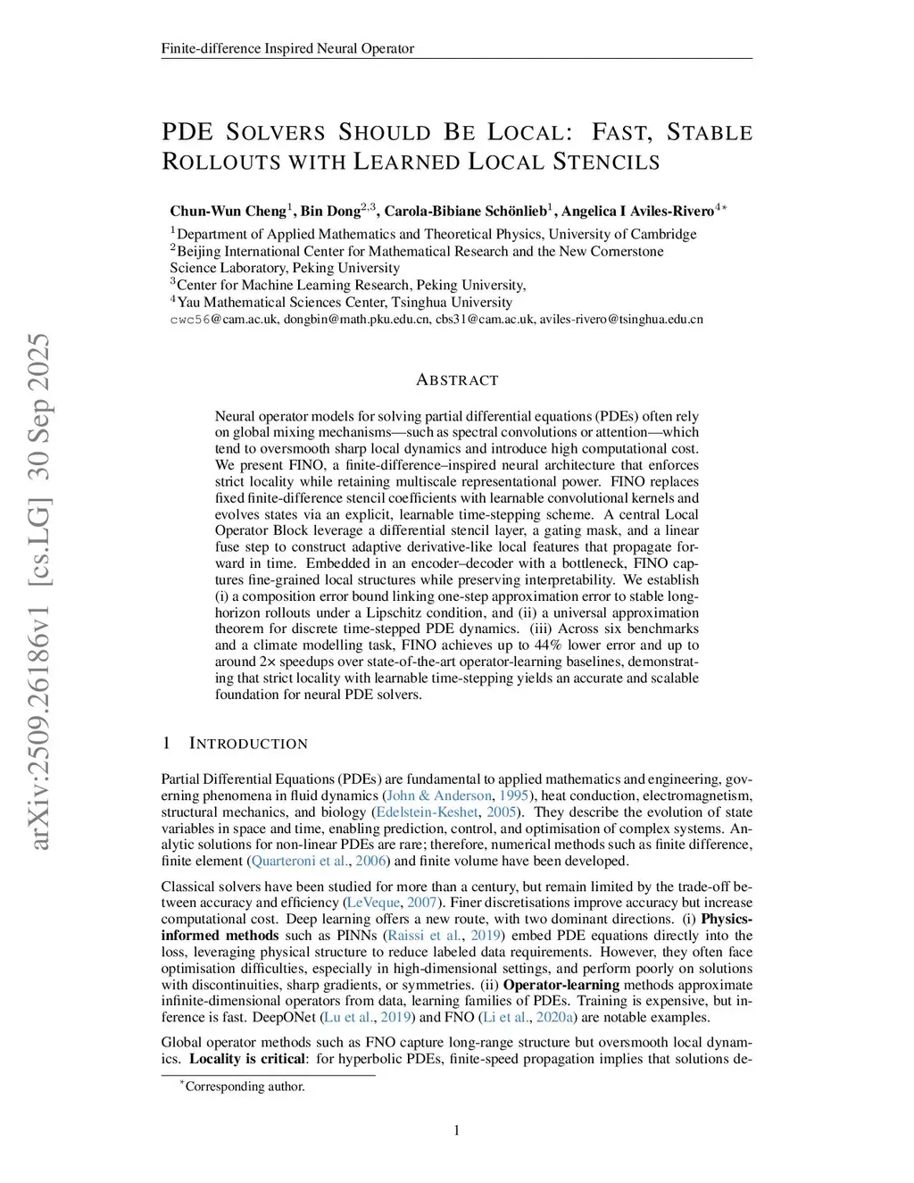 Neural operator models for solving partial differential equations (PDEs) often rely on global mixing mechanisms-such as spectral convolutions or attention-which tend to oversmooth sharp local dynamics and introduce high computational cost. We present FINO, a finite-difference-inspired neural architecture that enforces strict locality while retaining multiscale representational power. FINO replaces fixed finite-difference stencil coefficients with learnable convolutional kernels and evolves states via an explicit, learnable time-stepping scheme. A central Local Operator Block leverage a differential stencil layer, a gating mask, and a linear fuse step to construct adaptive derivative-like local features that propagate forward in time. Embedded in an encoder-decoder with a bottleneck, FINO captures fine-grained local structures while preserving interpretability. We establish (i) a composition error bound linking one-step approximation error to stable long-horizon rollouts under a Lipschitz condition, and (ii) a universal approximation theorem for discrete time-stepped PDE dynamics. (iii) Across six benchmarks and a climate modelling task, FINO achieves up to 44\% lower error and up to around 2\times speedups over state-of-the-art operator-learning baselines, demonstrating that strict locality with learnable time-stepping yields an accurate and scalable foundation for neural PDE solvers.