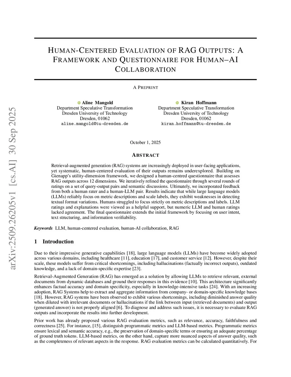 Retrieval-augmented generation (RAG) systems are increasingly deployed in user-facing applications, yet systematic, human-centered evaluation of their outputs remains underexplored. Building on Gienapp's utility-dimension framework, we designed a human-centred questionnaire that assesses RAG outputs across 12 dimensions. We iteratively refined the questionnaire through several rounds of ratings on a set of query-output pairs and semantic discussions. Ultimately, we incorporated feedback from both a human rater and a human-LLM pair. Results indicate that while large language models (LLMs) reliably focus on metric descriptions and scale labels, they exhibit weaknesses in detecting textual format variations. Humans struggled to focus strictly on metric descriptions and labels. LLM ratings and explanations were viewed as a helpful support, but numeric LLM and human ratings lacked agreement. The final questionnaire extends the initial framework by focusing on user intent, text structuring, and information verifiability.