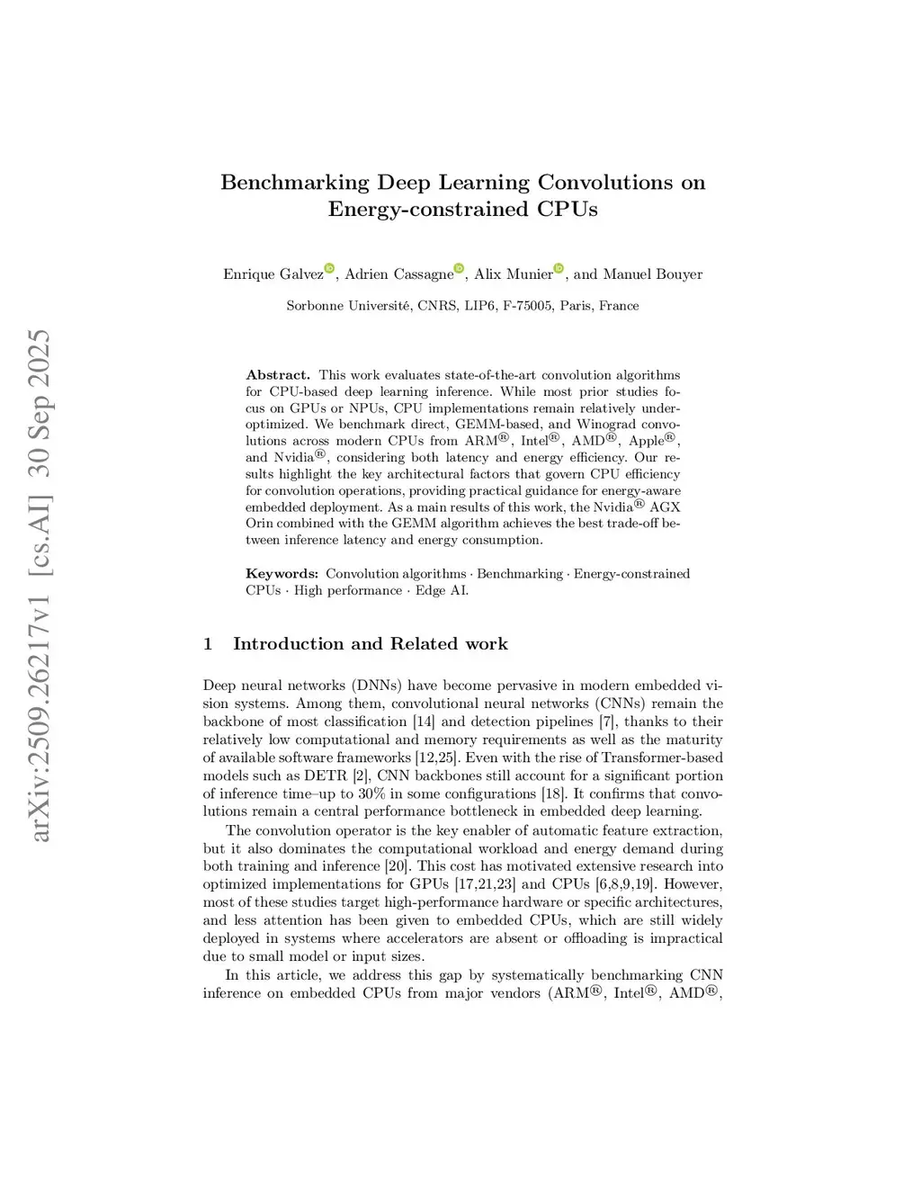 Benchmarking Deep Learning Convolutions on Energy-constrained CPUs