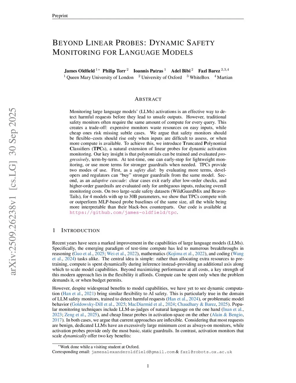 Monitoring large language models' (LLMs) activations is an effective way to detect harmful requests before they lead to unsafe outputs. However, traditional safety monitors often require the same amount of compute for every query. This creates a trade-off: expensive monitors waste resources on easy inputs, while cheap ones risk missing subtle cases. We argue that safety monitors should be flexible--costs should rise only when inputs are difficult to assess, or when more compute is available. To achieve this, we introduce Truncated Polynomial Classifiers (TPCs), a natural extension of linear probes for dynamic activation monitoring. Our key insight is that polynomials can be trained and evaluated progressively, term-by-term. At test-time, one can early-stop for lightweight monitoring, or use more terms for stronger guardrails when needed. TPCs provide two modes of use. First, as a safety dial: by evaluating more terms, developers and regulators can "buy" stronger guardrails from the same model. Second, as an adaptive cascade: clear cases exit early after low-order checks, and higher-order guardrails are evaluated only for ambiguous inputs, reducing overall monitoring costs. On two large-scale safety datasets (WildGuardMix and BeaverTails), for 4 models with up to 30B parameters, we show that TPCs compete with or outperform MLP-based probe baselines of the same size, all the while being more interpretable than their black-box counterparts. Our code is available atthis http URL.