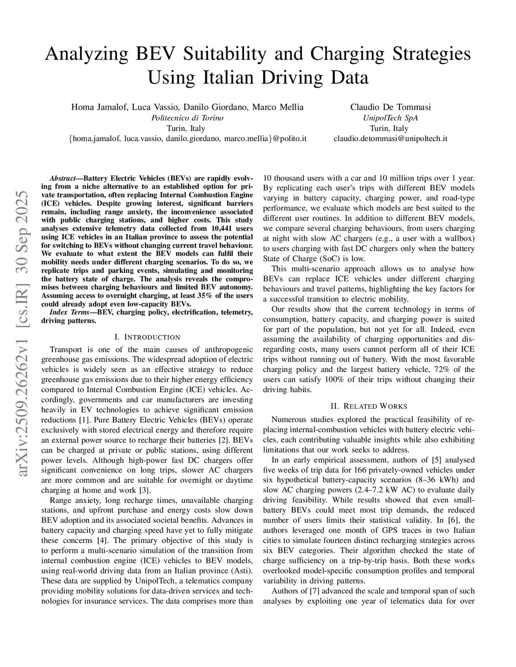 Analyzing BEV Suitability and Charging Strategies Using Italian Driving Data