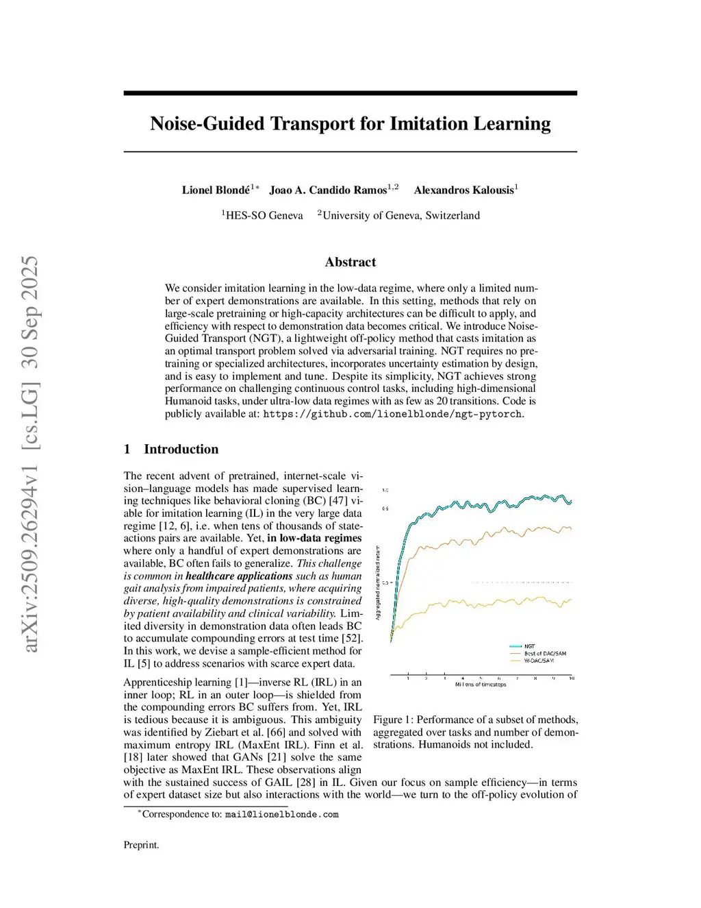 We consider imitation learning in the low-data regime, where only a limited number of expert demonstrations are available. In this setting, methods that rely on large-scale pretraining or high-capacity architectures can be difficult to apply, and efficiency with respect to demonstration data becomes critical. We introduce Noise-Guided Transport (NGT), a lightweight off-policy method that casts imitation as an optimal transport problem solved via adversarial training. NGT requires no pretraining or specialized architectures, incorporates uncertainty estimation by design, and is easy to implement and tune. Despite its simplicity, NGT achieves strong performance on challenging continuous control tasks, including high-dimensional Humanoid tasks, under ultra-low data regimes with as few as 20 transitions. Code is publicly available at:this https URL.