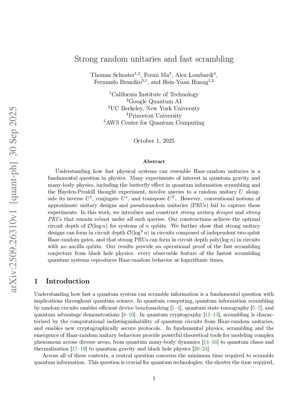 Understanding how fast physical systems can resemble Haar-random unitaries is a fundamental question in physics. Many experiments of interest in quantum gravity and many-body physics, including the butterfly effect in quantum information scrambling and the Hayden-Preskill thought experiment, involve queries to a random unitary alongside its inverse , conjugate , and transpose . However, conventional notions of approximate unitary designs and pseudorandom unitaries (PRUs) fail to capture these experiments. In this work, we introduce and construct strong unitary designs and strong PRUs that remain robust under all such queries. Our constructions achieve the optimal circuit depth of for systems of qubits. We further show that strong unitary designs can form in circuit depth in circuits composed of independent two-qubit Haar-random gates, and that strong PRUs can form in circuit depth in circuits with no ancilla qubits. Our results provide an operational proof of the fast scrambling conjecture from black hole physics: every observable feature of the fastest scrambling quantum systems reproduces Haar-random behavior at logarithmic times.