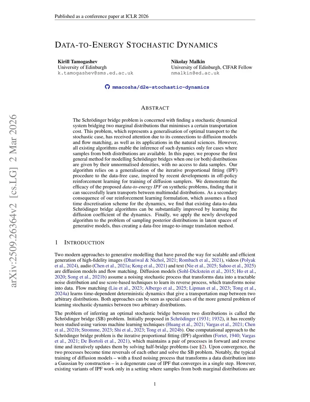 The Schrödinger bridge problem is concerned with finding a stochastic dynamical system bridging two marginal distributions that minimises a certain transportation cost. This problem, which represents a generalisation of optimal transport to the stochastic case, has received attention due to its connections to diffusion models and flow matching, as well as its applications in the natural sciences. However, all existing algorithms allow to infer such dynamics only for cases where samples from both distributions are available. In this paper, we propose the first general method for modelling Schrödinger bridges when one (or both) distributions are given by their unnormalised densities, with no access to data samples. Our algorithm relies on a generalisation of the iterative proportional fitting (IPF) procedure to the data-free case, inspired by recent developments in off-policy reinforcement learning for training of diffusion samplers. We demonstrate the efficacy of the proposed data-to-energy IPF on synthetic problems, finding that it can successfully learn transports between multimodal distributions. As a secondary consequence of our reinforcement learning formulation, which assumes a fixed time discretisation scheme for the dynamics, we find that existing data-to-data Schrödinger bridge algorithms can be substantially improved by learning the diffusion coefficient of the dynamics. Finally, we apply the newly developed algorithm to the problem of sampling posterior distributions in latent spaces of generative models, thus creating a data-free image-to-image translation method. Code:this https URL