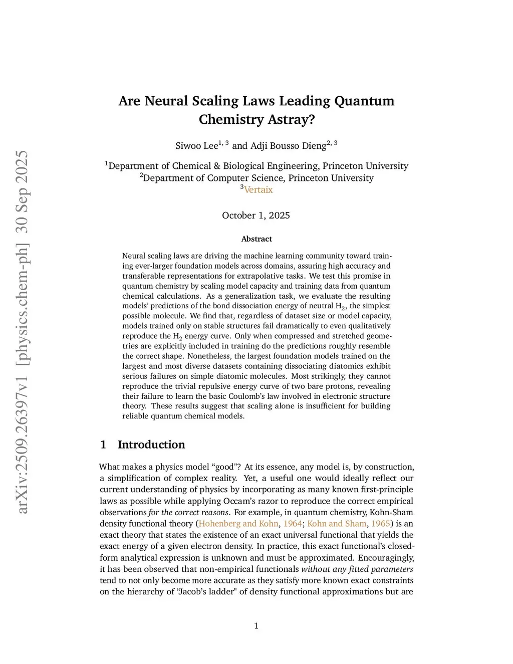 Neural scaling laws are driving the machine learning community toward training ever-larger foundation models across domains, assuring high accuracy and transferable representations for extrapolative tasks. We test this promise in quantum chemistry by scaling model capacity and training data from quantum chemical calculations. As a generalization task, we evaluate the resulting models' predictions of the bond dissociation energy of neutral H, the simplest possible molecule. We find that, regardless of dataset size or model capacity, models trained only on stable structures fail dramatically to even qualitatively reproduce the H energy curve. Only when compressed and stretched geometries are explicitly included in training do the predictions roughly resemble the correct shape. Nonetheless, the largest foundation models trained on the largest and most diverse datasets containing dissociating diatomics exhibit serious failures on simple diatomic molecules. Most strikingly, they cannot reproduce the trivial repulsive energy curve of two bare protons, revealing their failure to learn the basic Coulomb's law involved in electronic structure theory. These results suggest that scaling alone is insufficient for building reliable quantum chemical models.