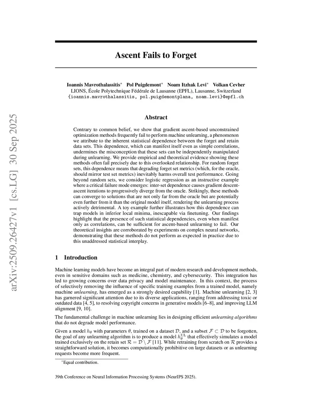 Contrary to common belief, we show that gradient ascent-based unconstrained optimization methods frequently fail to perform machine unlearning, a phenomenon we attribute to the inherent statistical dependence between the forget and retain data sets. This dependence, which can manifest itself even as simple correlations, undermines the misconception that these sets can be independently manipulated during unlearning. We provide empirical and theoretical evidence showing these methods often fail precisely due to this overlooked relationship. For random forget sets, this dependence means that degrading forget set metrics (which, for a retrained model, should mirror test set metrics) inevitably harms overall test performance. Going beyond random sets, we consider logistic regression as an instructive example where a critical failure mode emerges: inter-set dependence causes gradient descent-ascent iterations to progressively diverge from the ideal retrained model. Strikingly, these methods can converge to solutions that are not only far from the retrained ideal but are potentially even further from it than the original model itself, rendering the unlearning process actively detrimental. A toy example further illustrates how this dependence can trap models in inferior local minima, inescapable via finetuning. Our findings highlight that the presence of such statistical dependencies, even when manifest only as correlations, can be sufficient for ascent-based unlearning to fail. Our theoretical insights are corroborated by experiments on complex neural networks, demonstrating that these methods do not perform as expected in practice due to this unaddressed statistical interplay.