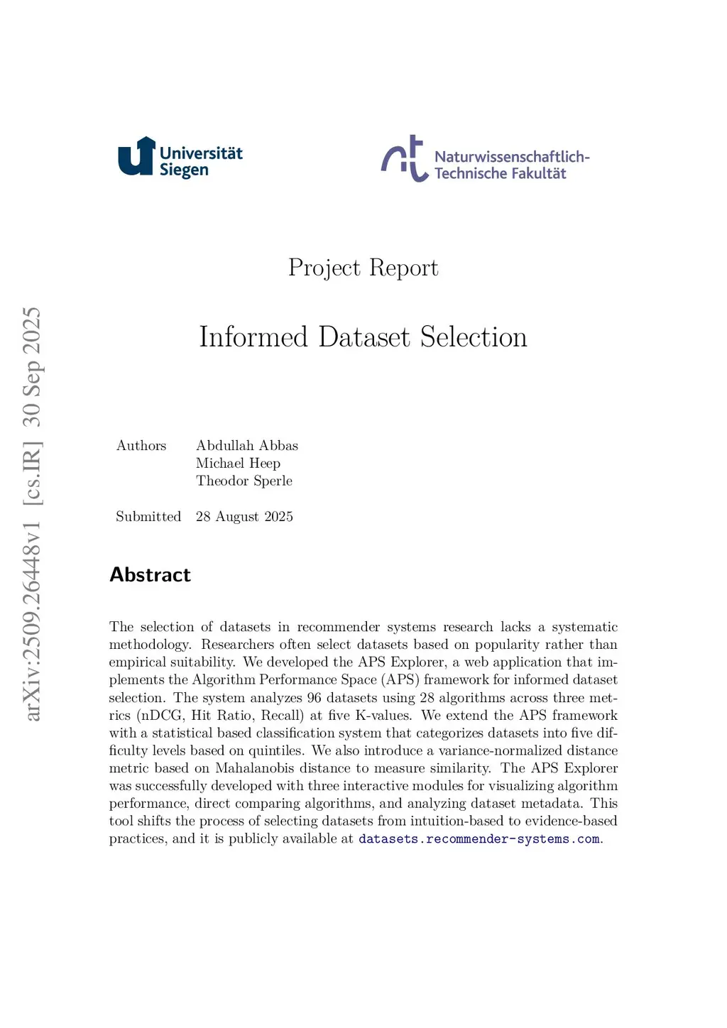 The selection of datasets in recommender systems research lacks a systematic methodology. Researchers often select datasets based on popularity rather than empirical suitability. We developed the APS Explorer, a web application that im- plements the Algorithm Performance Space (APS) framework for informed dataset selection. The system analyzes 96 datasets using 28 algorithms across three metrics (nDCG, Hit Ratio, Recall) at five K-values. We extend the APS framework with a statistical based classification system that categorizes datasets into five difficulty levels based on quintiles. We also introduce a variance-normalized distance metric based on Mahalanobis distance to measure similarity. The APS Explorer was successfully developed with three interactive modules for visualizing algorithm performance, direct comparing algorithms, and analyzing dataset metadata. This tool shifts the process of selecting datasets from intuition-based to evidence-based practices, and it is publicly available atthis http URL.