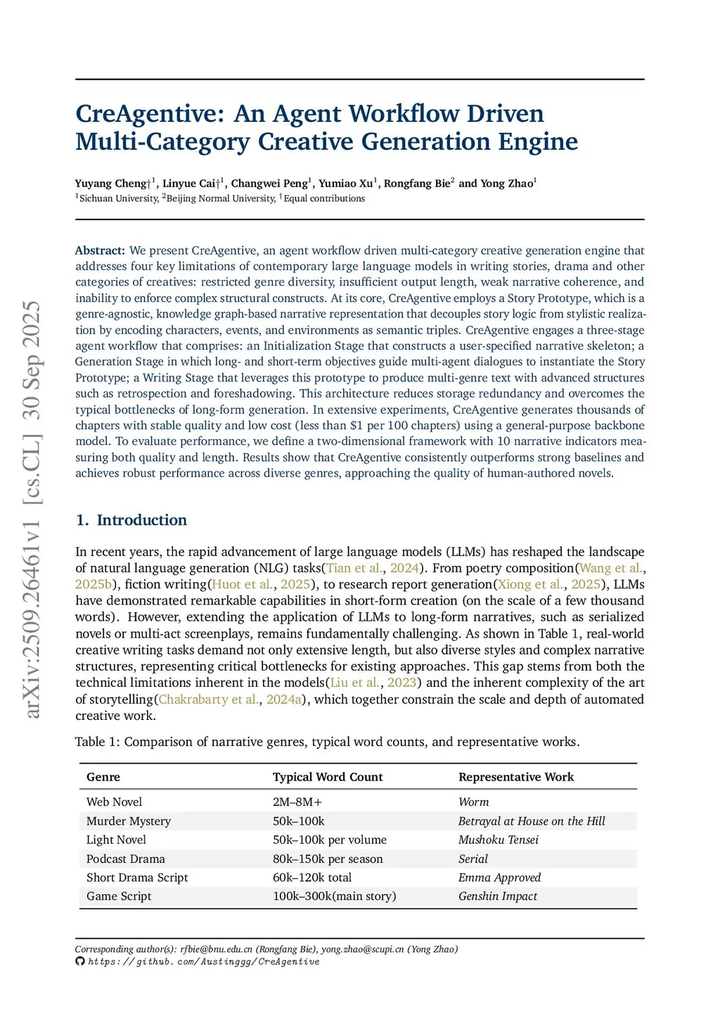 We present CreAgentive, an agent workflow driven multi-category creative generation engine that addresses four key limitations of contemporary large language models in writing stories, drama and other categories of creatives: restricted genre diversity, insufficient output length, weak narrative coherence, and inability to enforce complex structural constructs. At its core, CreAgentive employs a Story Prototype, which is a genre-agnostic, knowledge graph-based narrative representation that decouples story logic from stylistic realization by encoding characters, events, and environments as semantic triples. CreAgentive engages a three-stage agent workflow that comprises: an Initialization Stage that constructs a user-specified narrative skeleton; a Generation Stage in which long- and short-term objectives guide multi-agent dialogues to instantiate the Story Prototype; a Writing Stage that leverages this prototype to produce multi-genre text with advanced structures such as retrospection and foreshadowing. This architecture reduces storage redundancy and overcomes the typical bottlenecks of long-form generation. In extensive experiments, CreAgentive generates thousands of chapters with stable quality and low cost (less than $1 per 100 chapters) using a general-purpose backbone model. To evaluate performance, we define a two-dimensional framework with 10 narrative indicators measuring both quality and length. Results show that CreAgentive consistently outperforms strong baselines and achieves robust performance across diverse genres, approaching the quality of human-authored novels.