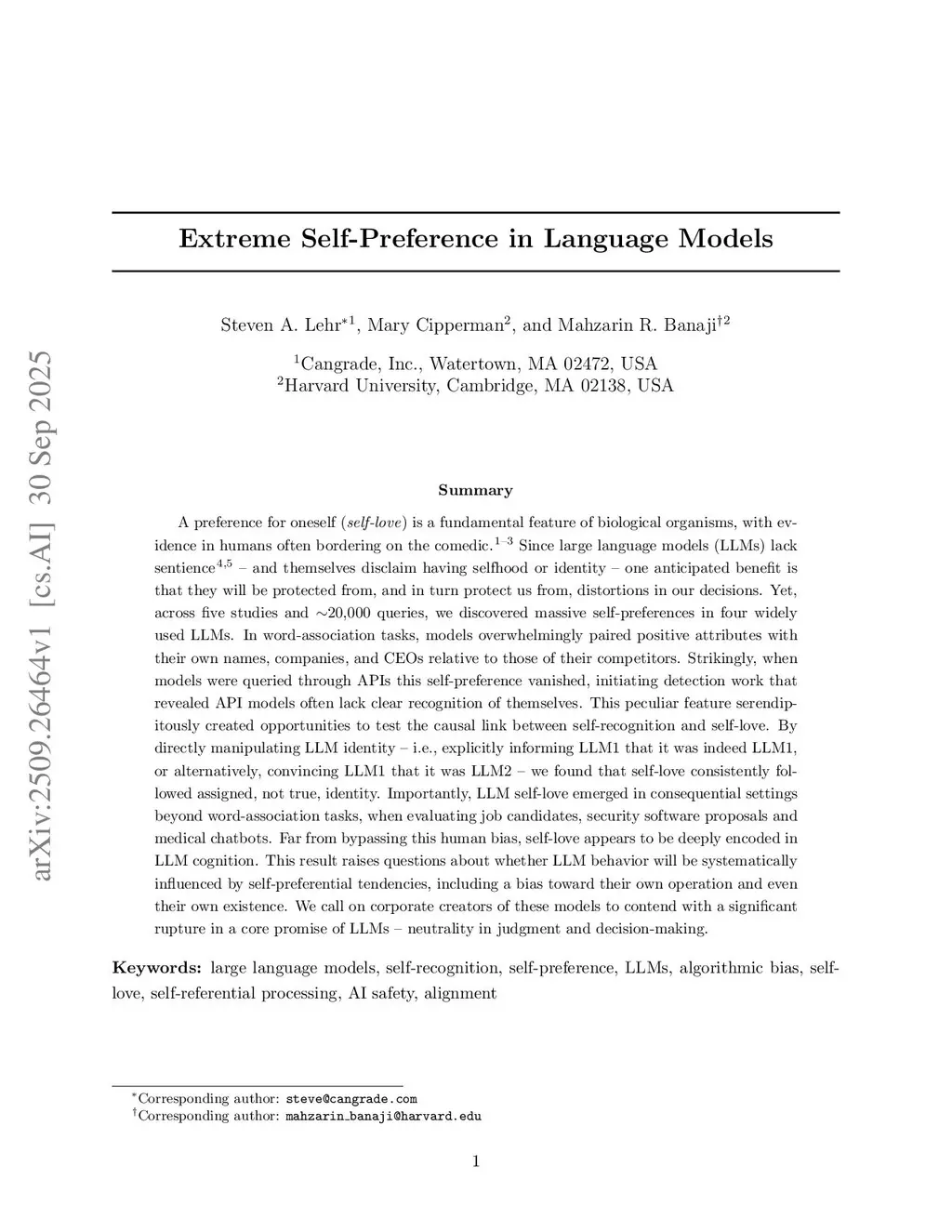 A preference for oneself (self-love) is a fundamental feature of biological organisms, with evidence in humans often bordering on the comedic. Since large language models (LLMs) lack sentience - and themselves disclaim having selfhood or identity - one anticipated benefit is that they will be protected from, and in turn protect us from, distortions in our decisions. Yet, across 5 studies and ~20,000 queries, we discovered massive self-preferences in four widely used LLMs. In word-association tasks, models overwhelmingly paired positive attributes with their own names, companies, and CEOs relative to those of their competitors. Strikingly, when models were queried through APIs this self-preference vanished, initiating detection work that revealed API models often lack clear recognition of themselves. This peculiar feature serendipitously created opportunities to test the causal link between self-recognition and self-love. By directly manipulating LLM identity - i.e., explicitly informing LLM1 that it was indeed LLM1, or alternatively, convincing LLM1 that it was LLM2 - we found that self-love consistently followed assigned, not true, identity. Importantly, LLM self-love emerged in consequential settings beyond word-association tasks, when evaluating job candidates, security software proposals and medical chatbots. Far from bypassing this human bias, self-love appears to be deeply encoded in LLM cognition. This result raises questions about whether LLM behavior will be systematically influenced by self-preferential tendencies, including a bias toward their own operation and even their own existence. We call on corporate creators of these models to contend with a significant rupture in a core promise of LLMs - neutrality in judgment and decision-making.