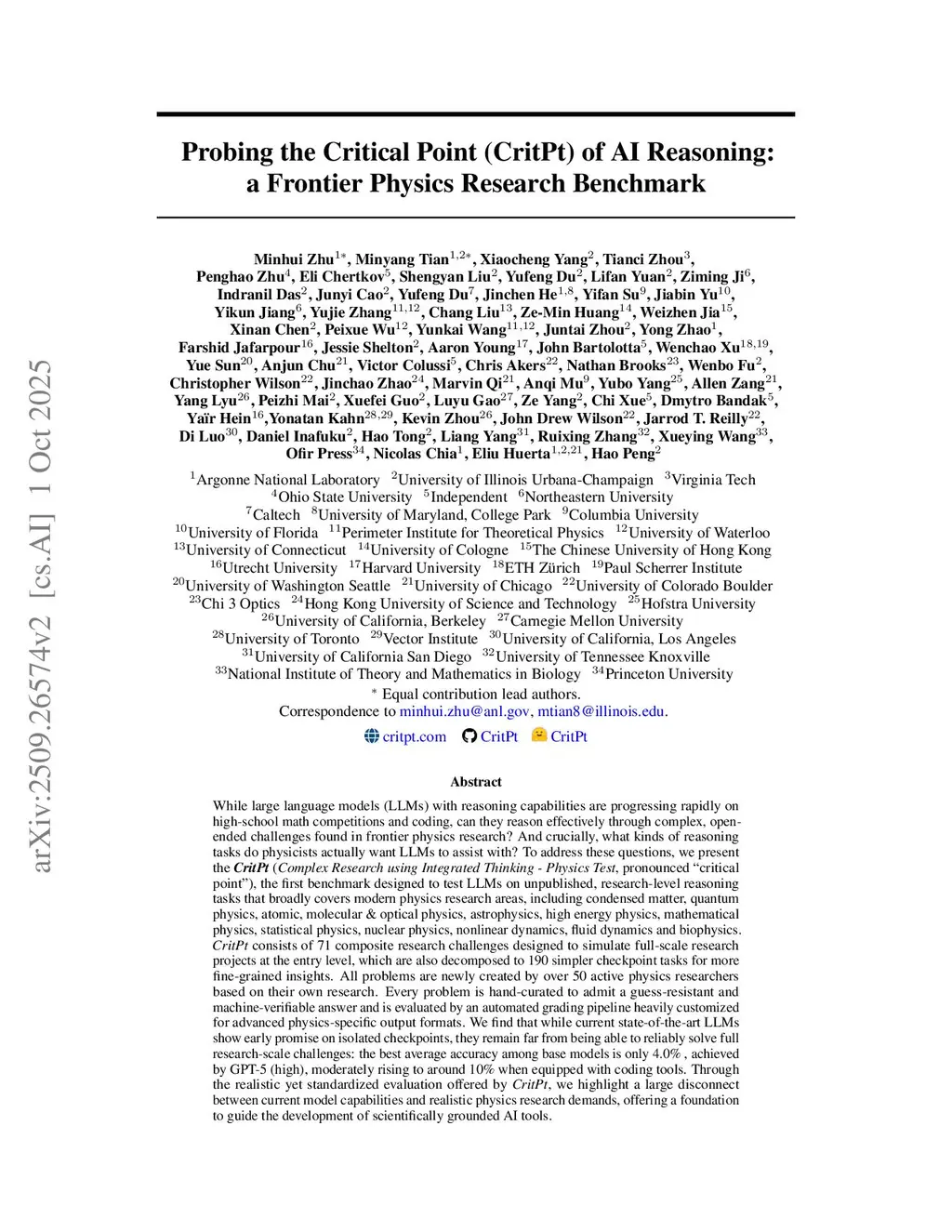 While large language models (LLMs) with reasoning capabilities are progressing rapidly on high-school math competitions and coding, can they reason effectively through complex, open-ended challenges found in frontier physics research? And crucially, what kinds of reasoning tasks do physicists want LLMs to assist with? To address these questions, we present the CritPt (Complex Research using Integrated Thinking - Physics Test, pronounced "critical point"), the first benchmark designed to test LLMs on unpublished, research-level reasoning tasks that broadly covers modern physics research areas, including condensed matter, quantum physics, atomic, molecular & optical physics, astrophysics, high energy physics, mathematical physics, statistical physics, nuclear physics, nonlinear dynamics, fluid dynamics and biophysics. CritPt consists of 71 composite research challenges designed to simulate full-scale research projects at the entry level, which are also decomposed to 190 simpler checkpoint tasks for more fine-grained insights. All problems are newly created by 50+ active physics researchers based on their own research. Every problem is hand-curated to admit a guess-resistant and machine-verifiable answer and is evaluated by an automated grading pipeline heavily customized for advanced physics-specific output formats. We find that while current state-of-the-art LLMs show early promise on isolated checkpoints, they remain far from being able to reliably solve full research-scale challenges: the best average accuracy among base models is only 4.0% , achieved by GPT-5 (high), moderately rising to around 10% when equipped with coding tools. Through the realistic yet standardized evaluation offered by CritPt, we highlight a large disconnect between current model capabilities and realistic physics research demands, offering a foundation to guide the development of scientifically grounded AI tools.