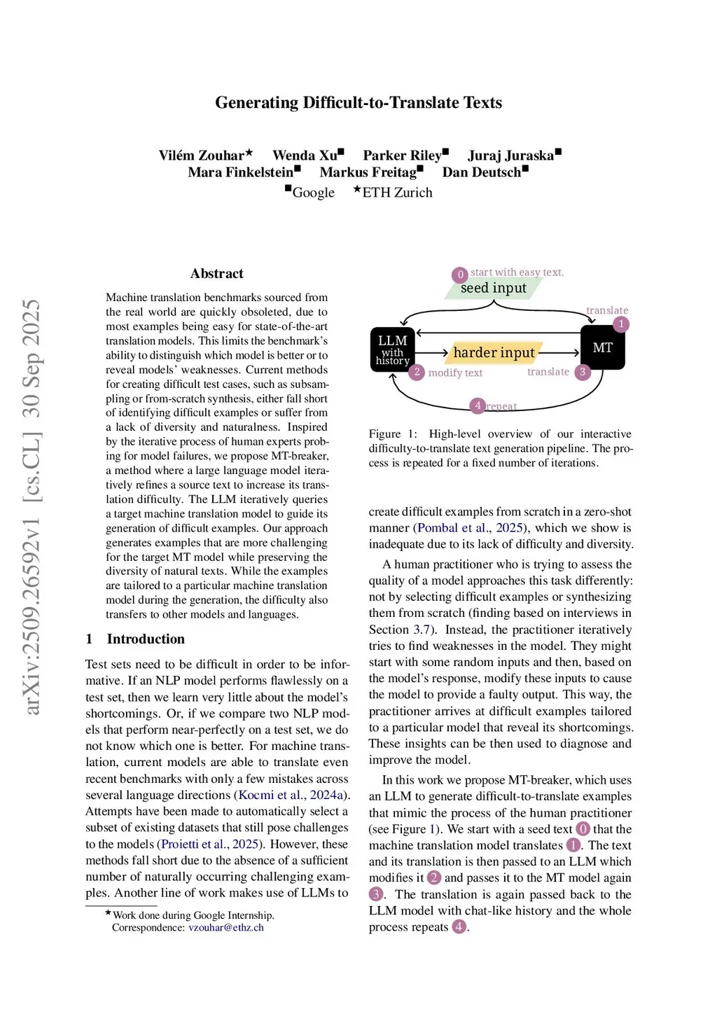 Machine translation benchmarks sourced from the real world are quickly obsoleted, due to most examples being easy for state-of-the-art translation models. This limits the benchmark's ability to distinguish which model is better or to reveal models' weaknesses. Current methods for creating difficult test cases, such as subsampling or from-scratch synthesis, either fall short of identifying difficult examples or suffer from a lack of diversity and naturalness. Inspired by the iterative process of human experts probing for model failures, we propose MT-breaker, a method where a large language model iteratively refines a source text to increase its translation difficulty. The LLM iteratively queries a target machine translation model to guide its generation of difficult examples. Our approach generates examples that are more challenging for the target MT model while preserving the diversity of natural texts. While the examples are tailored to a particular machine translation model during the generation, the difficulty also transfers to other models and languages.