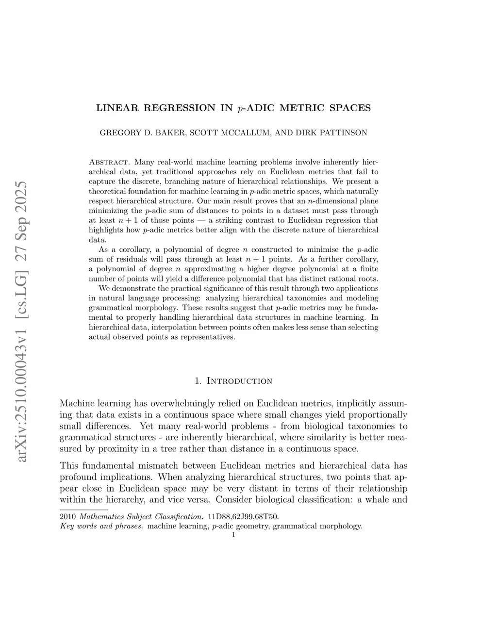 Many real-world machine learning problems involve inherently hierarchical data, yet traditional approaches rely on Euclidean metrics that fail to capture the discrete, branching nature of hierarchical relationships. We present a theoretical foundation for machine learning in p-adic metric spaces, which naturally respect hierarchical structure. Our main result proves that an n-dimensional plane minimizing the p-adic sum of distances to points in a dataset must pass through at least n + 1 of those points -- a striking contrast to Euclidean regression that highlights how p-adic metrics better align with the discrete nature of hierarchical data. As a corollary, a polynomial of degree n constructed to minimise the p-adic sum of residuals will pass through at least n + 1 points. As a further corollary, a polynomial of degree n approximating a higher degree polynomial at a finite number of points will yield a difference polynomial that has distinct rational roots. We demonstrate the practical significance of this result through two applications in natural language processing: analyzing hierarchical taxonomies and modeling grammatical morphology. These results suggest that p-adic metrics may be fundamental to properly handling hierarchical data structures in machine learning. In hierarchical data, interpolation between points often makes less sense than selecting actual observed points as representatives.