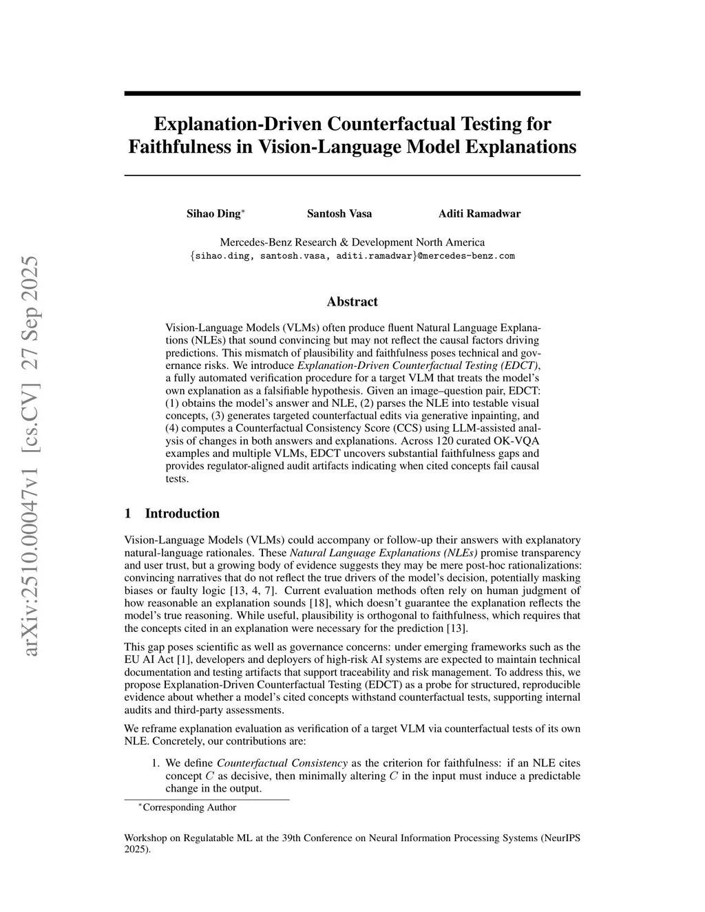 Vision-Language Models (VLMs) often produce fluent Natural Language Explanations (NLEs) that sound convincing but may not reflect the causal factors driving predictions. This mismatch of plausibility and faithfulness poses technical and governance risks. We introduce Explanation-Driven Counterfactual Testing (EDCT), a fully automated verification procedure for a target VLM that treats the model's own explanation as a falsifiable hypothesis. Given an image-question pair, EDCT: (1) obtains the model's answer and NLE, (2) parses the NLE into testable visual concepts, (3) generates targeted counterfactual edits via generative inpainting, and (4) computes a Counterfactual Consistency Score (CCS) using LLM-assisted analysis of changes in both answers and explanations. Across 120 curated OK-VQA examples and multiple VLMs, EDCT uncovers substantial faithfulness gaps and provides regulator-aligned audit artifacts indicating when cited concepts fail causal tests.