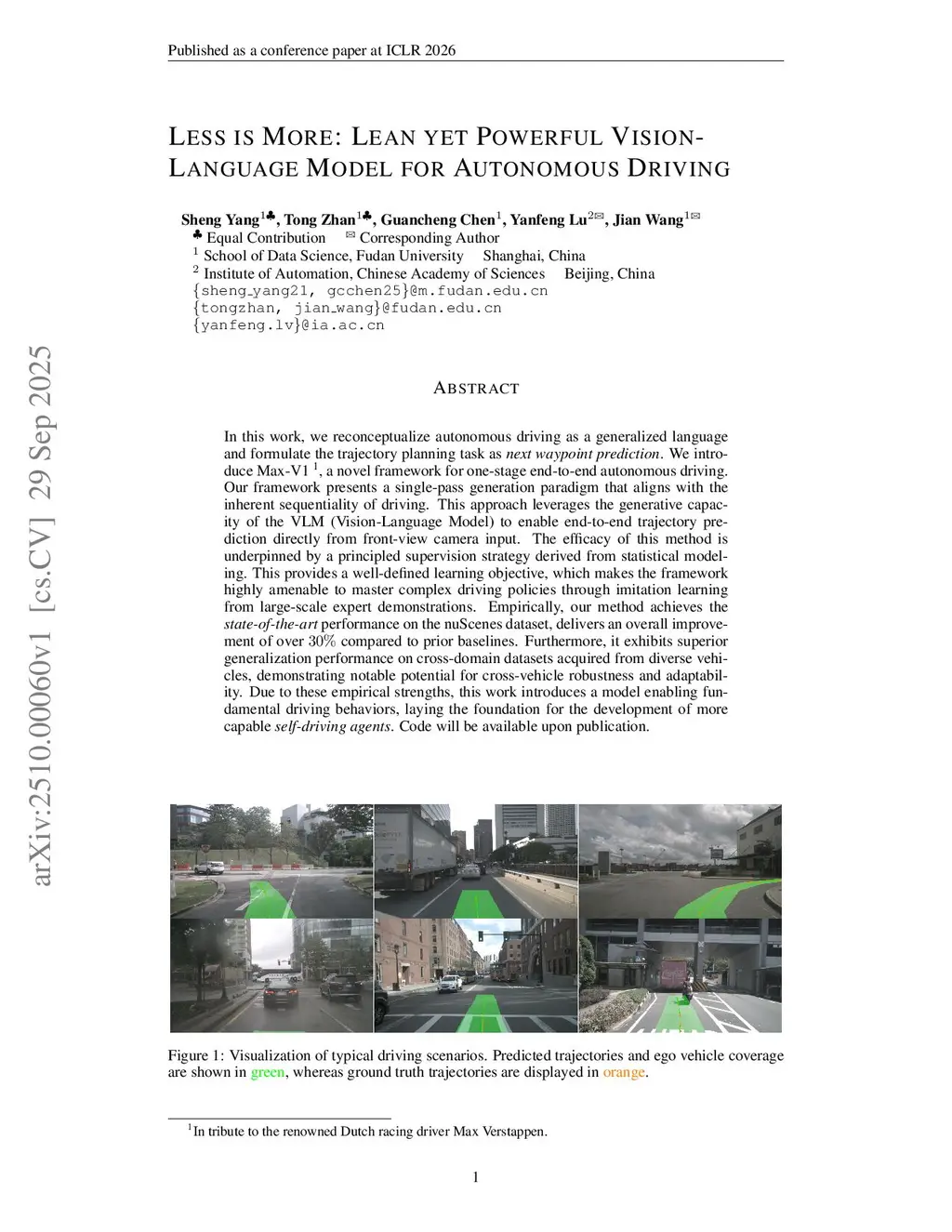 In this work, we reconceptualize autonomous driving as a generalized language problem and formulate the trajectory planning task as next waypoint prediction. We introduce Max-V1, a novel framework for one-stage end-to-end autonomous driving, named in tribute to the renowned Dutch racing driver Max Verstappen. Our framework presents a single-pass generation paradigm that aligns with the inherent sequentiality of driving. This approach leverages the generative capacity of the Vision-Language Model (VLM) to enable end-to-end trajectory prediction directly from front-view camera input. The efficacy of this method is underpinned by a principled supervision strategy derived from statistical modeling. This provides a well-defined learning objective, which makes the framework highly amenable to mastering complex driving policies through imitation learning from large-scale expert demonstrations. Empirically, our method achieves state-of-the-art performance on the nuScenes dataset, delivering an overall improvement of over 30% compared to prior baselines. Furthermore, it exhibits superior generalization performance on cross-domain datasets acquired from diverse vehicles, demonstrating notable potential for cross-vehicle robustness and adaptability. With these empirical strengths, this work introduces a model that enables fundamental driving behaviors, laying the foundation for the development of more capable self-driving agents. Code will be available upon publication.