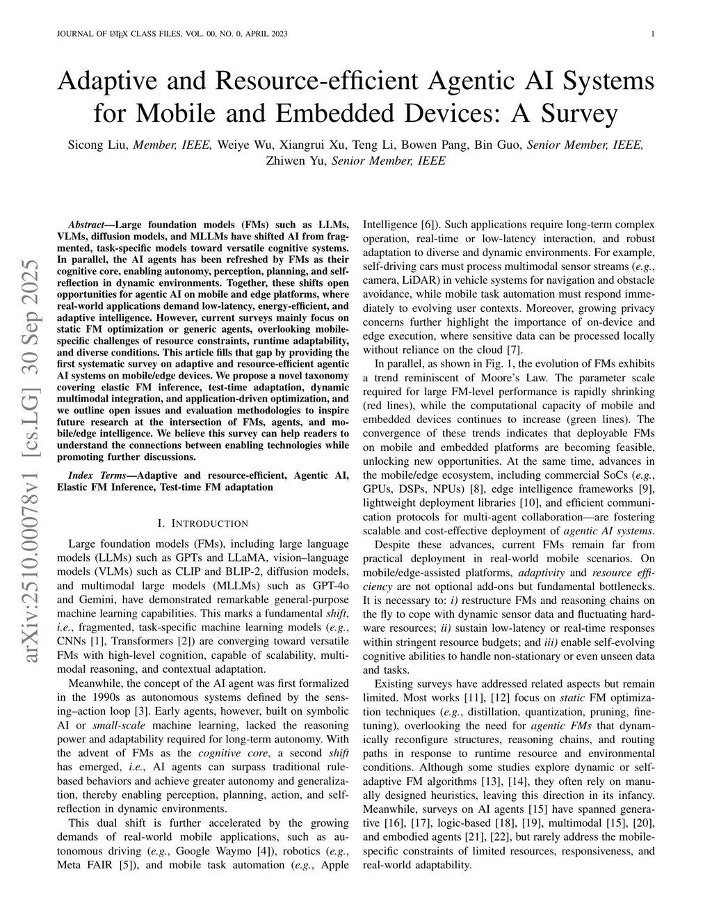 Foundation models have reshaped AI by unifying fragmented architectures into scalable backbones with multimodal reasoning and contextual adaptation. In parallel, the long-standing notion of AI agents, defined by the sensing-decision-action loop, is entering a new paradigm: with FMs as their cognitive core, agents transcend rule-based behaviors to achieve autonomy, generalization, and self-reflection. This dual shift is reinforced by real-world demands such as autonomous driving, robotics, virtual assistants, and GUI agents, as well as ecosystem advances in embedded hardware, edge computing, mobile deployment platforms, and communication protocols that together enable large-scale deployment. Yet this convergence collides with reality: while applications demand long-term adaptability and real-time interaction, mobile and edge deployments remain constrained by memory, energy, bandwidth, and latency. This creates a fundamental tension between the growing complexity of FMs and the limited resources of deployment environments. This survey provides the first systematic characterization of adaptive, resource-efficient agentic AI systems. We summarize enabling techniques into elastic inference, test-time adaptation, dynamic multimodal integration, and agentic AI applications, and identify open challenges in balancing accuracy-latency-communication trade-offs and sustaining robustness under distribution shifts. We further highlight future opportunities in algorithm-system co-design, cognitive adaptation, and collaborative edge deployment. By mapping FM structures, cognition, and hardware resources, this work establishes a unified perspective toward scalable, adaptive, and resource-efficient agentic AI. We believe this survey can help readers to understand the connections between enabling technologies while promoting further discussions on the fusion of agentic intelligence and intelligent agents.