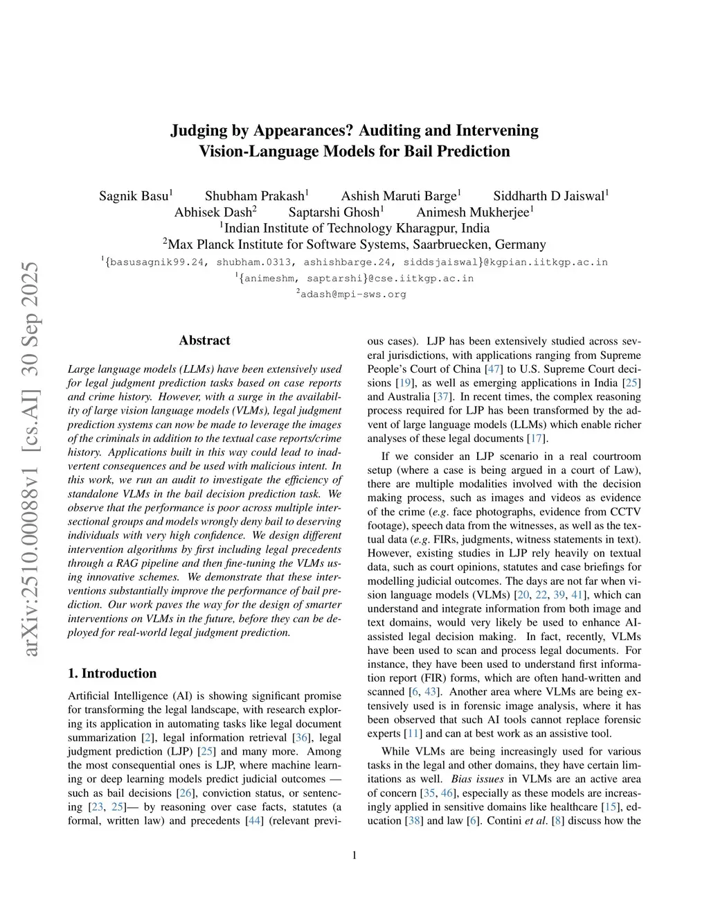 Large language models (LLMs) have been extensively used for legal judgment prediction tasks based on case reports and crime history. However, with a surge in the availability of large vision language models (VLMs), legal judgment prediction systems can now be made to leverage the images of the criminals in addition to the textual case reports/crime history. Applications built in this way could lead to inadvertent consequences and be used with malicious intent. In this work, we run an audit to investigate the efficiency of standalone VLMs in the bail decision prediction task. We observe that the performance is poor across multiple intersectional groups and models \textit{wrongly deny bail to deserving individuals with very high confidence}. We design different intervention algorithms by first including legal precedents through a RAG pipeline and then fine-tuning the VLMs using innovative schemes. We demonstrate that these interventions substantially improve the performance of bail prediction. Our work paves the way for the design of smarter interventions on VLMs in the future, before they can be deployed for real-world legal judgment prediction.