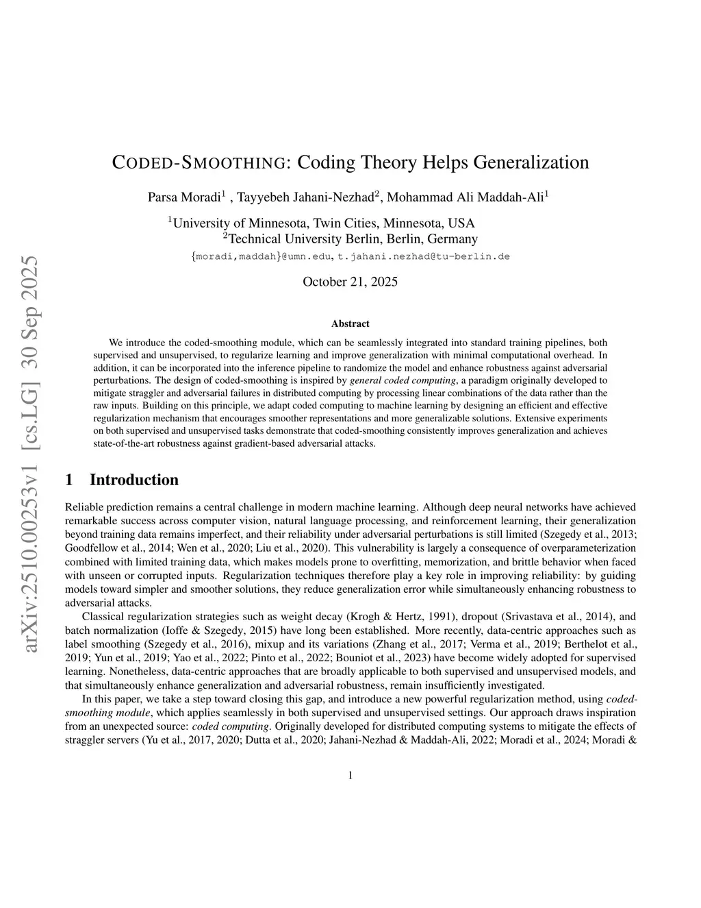 We introduce the coded-smoothing module, which can be seamlessly integrated into standard training pipelines, both supervised and unsupervised, to regularize learning and improve generalization with minimal computational overhead. In addition, it can be incorporated into the inference pipeline to randomize the model and enhance robustness against adversarial perturbations. The design of coded-smoothing is inspired by general coded computing, a paradigm originally developed to mitigate straggler and adversarial failures in distributed computing by processing linear combinations of the data rather than the raw inputs. Building on this principle, we adapt coded computing to machine learning by designing an efficient and effective regularization mechanism that encourages smoother representations and more generalizable solutions. Extensive experiments on both supervised and unsupervised tasks demonstrate that coded-smoothing consistently improves generalization and achieves state-of-the-art robustness against gradient-based adversarial attacks.