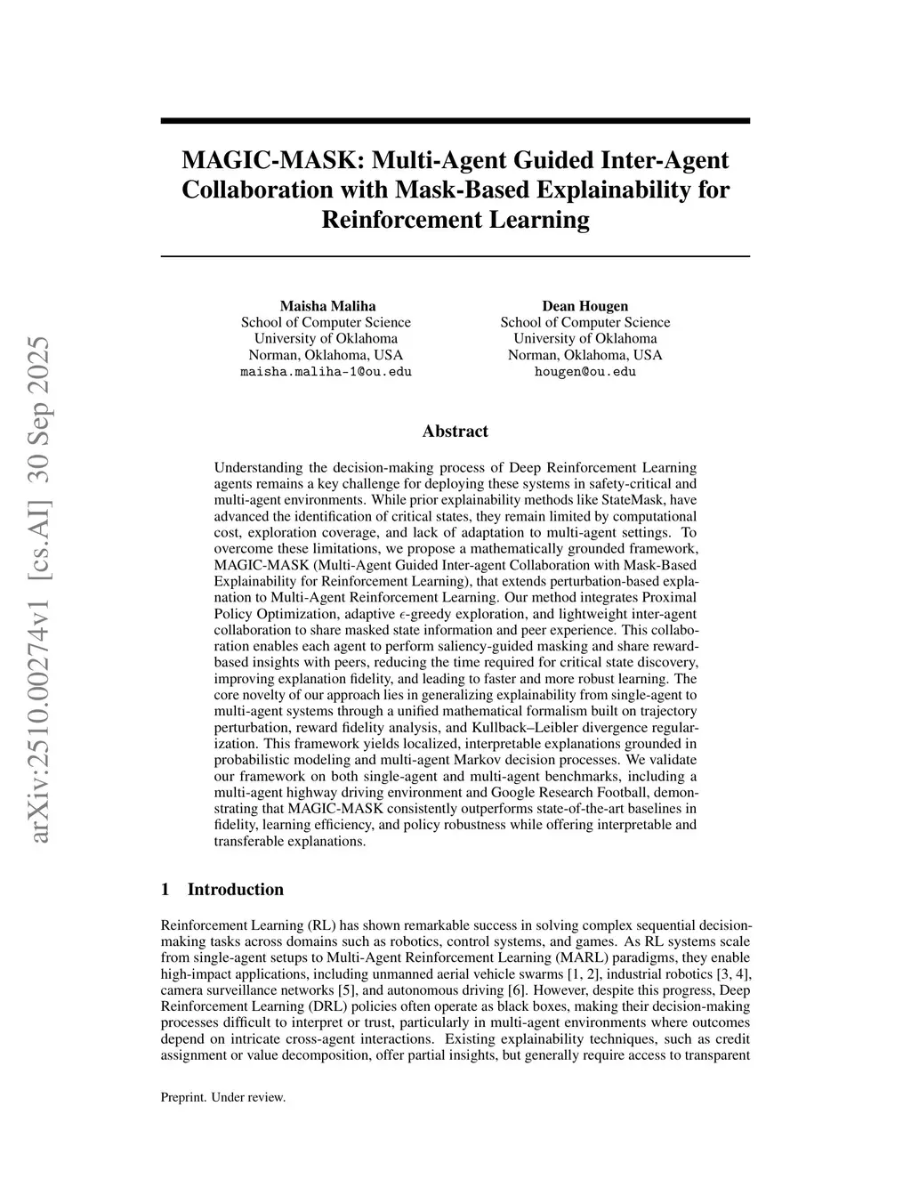 Understanding the decision-making process of Deep Reinforcement Learning agents remains a key challenge for deploying these systems in safety-critical and multi-agent environments. While prior explainability methods like StateMask, have advanced the identification of critical states, they remain limited by computational cost, exploration coverage, and lack of adaptation to multi-agent settings. To overcome these limitations, we propose a mathematically grounded framework, MAGIC-MASK (Multi-Agent Guided Inter-agent Collaboration with Mask-Based Explainability for Reinforcement Learning), that extends perturbation-based explanation to Multi-Agent Reinforcement Learning. Our method integrates Proximal Policy Optimization, adaptive epsilon-greedy exploration, and lightweight inter-agent collaboration to share masked state information and peer experience. This collaboration enables each agent to perform saliency-guided masking and share reward-based insights with peers, reducing the time required for critical state discovery, improving explanation fidelity, and leading to faster and more robust learning. The core novelty of our approach lies in generalizing explainability from single-agent to multi-agent systems through a unified mathematical formalism built on trajectory perturbation, reward fidelity analysis, and Kullback-Leibler divergence regularization. This framework yields localized, interpretable explanations grounded in probabilistic modeling and multi-agent Markov decision processes. We validate our framework on both single-agent and multi-agent benchmarks, including a multi-agent highway driving environment and Google Research Football, demonstrating that MAGIC-MASK consistently outperforms state-of-the-art baselines in fidelity, learning efficiency, and policy robustness while offering interpretable and transferable explanations.