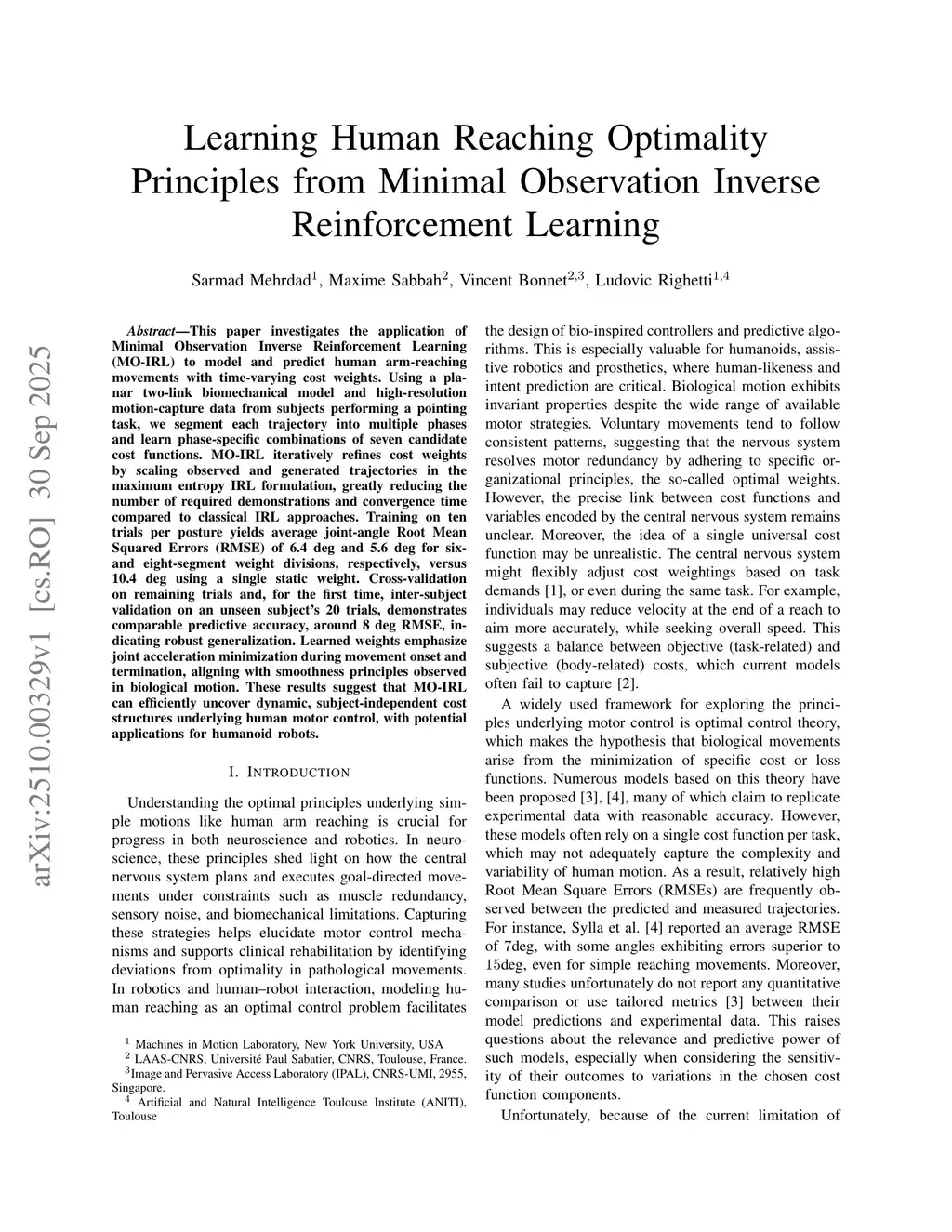 Learning Human Reaching Optimality Principles from Minimal Observation Inverse Reinforcement Learning