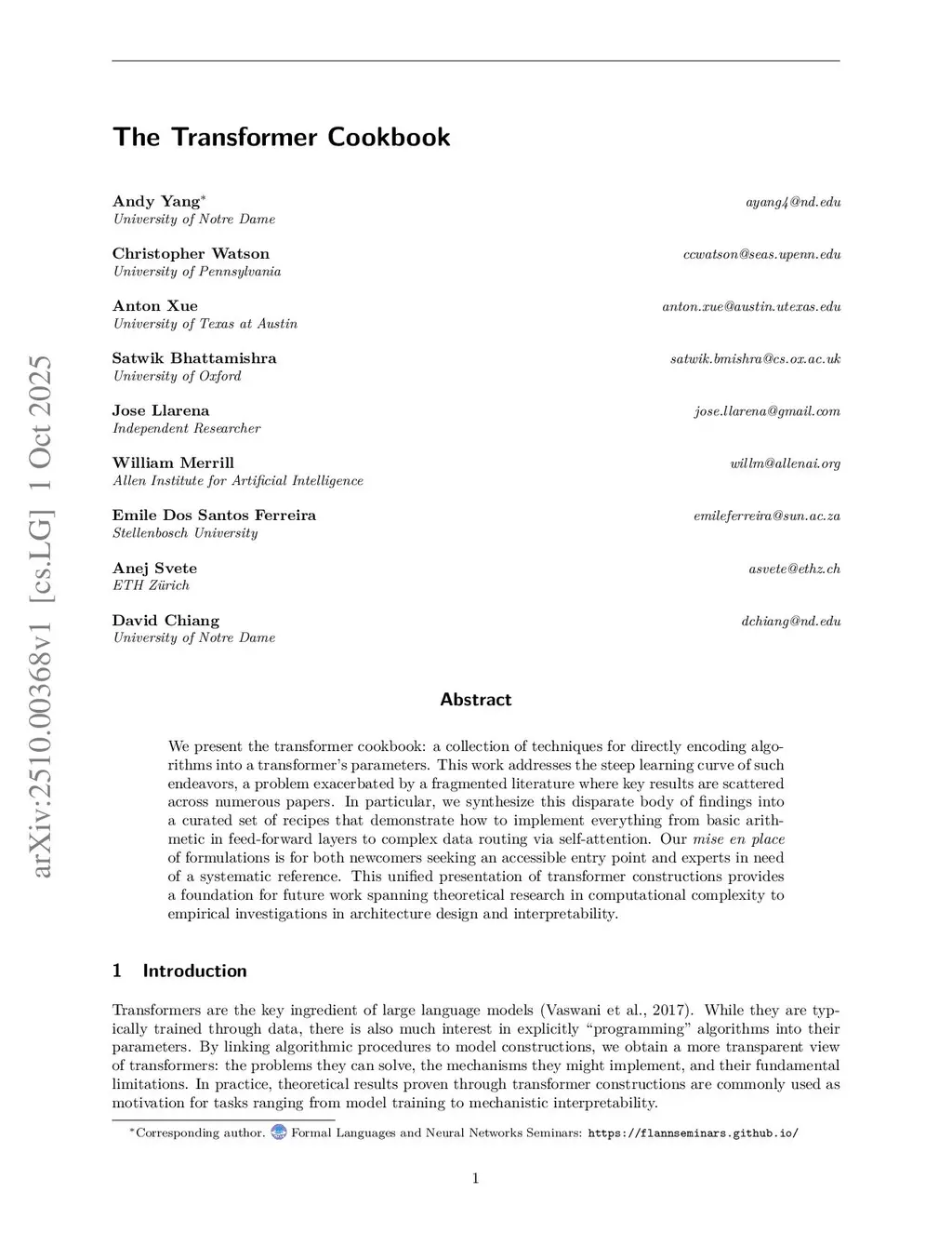 We present the transformer cookbook: a collection of techniques for directly encoding algorithms into a transformer's parameters. This work addresses the steep learning curve of such endeavors, a problem exacerbated by a fragmented literature where key results are scattered across numerous papers. In particular, we synthesize this disparate body of findings into a curated set of recipes that demonstrate how to implement everything from basic arithmetic in feed-forward layers to complex data routing via self-attention. Our mise en place of formulations is for both newcomers seeking an accessible entry point and experts in need of a systematic reference. This unified presentation of transformer constructions provides a foundation for future work spanning theoretical research in computational complexity to empirical investigations in architecture design and interpretability.