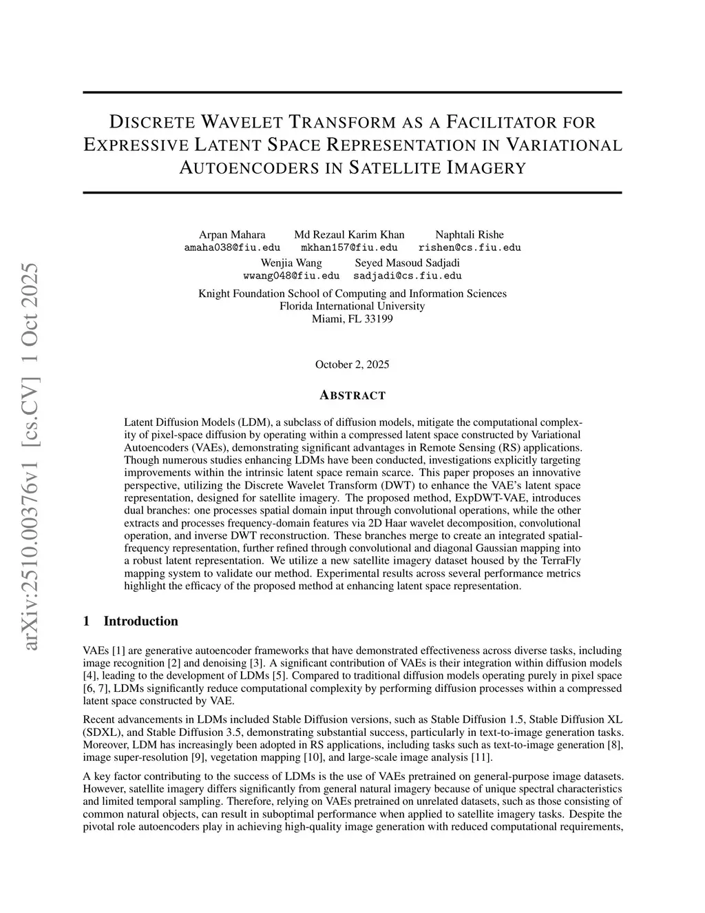 Latent Diffusion Models (LDM), a subclass of diffusion models, mitigate the computational complexity of pixel-space diffusion by operating within a compressed latent space constructed by Variational Autoencoders (VAEs), demonstrating significant advantages in Remote Sensing (RS) applications. Though numerous studies enhancing LDMs have been conducted, investigations explicitly targeting improvements within the intrinsic latent space remain scarce. This paper proposes an innovative perspective, utilizing the Discrete Wavelet Transform (DWT) to enhance the VAE's latent space representation, designed for satellite imagery. The proposed method, ExpDWT-VAE, introduces dual branches: one processes spatial domain input through convolutional operations, while the other extracts and processes frequency-domain features via 2D Haar wavelet decomposition, convolutional operation, and inverse DWT reconstruction. These branches merge to create an integrated spatial-frequency representation, further refined through convolutional and diagonal Gaussian mapping into a robust latent representation. We utilize a new satellite imagery dataset housed by the TerraFly mapping system to validate our method. Experimental results across several performance metrics highlight the efficacy of the proposed method at enhancing latent space representation.