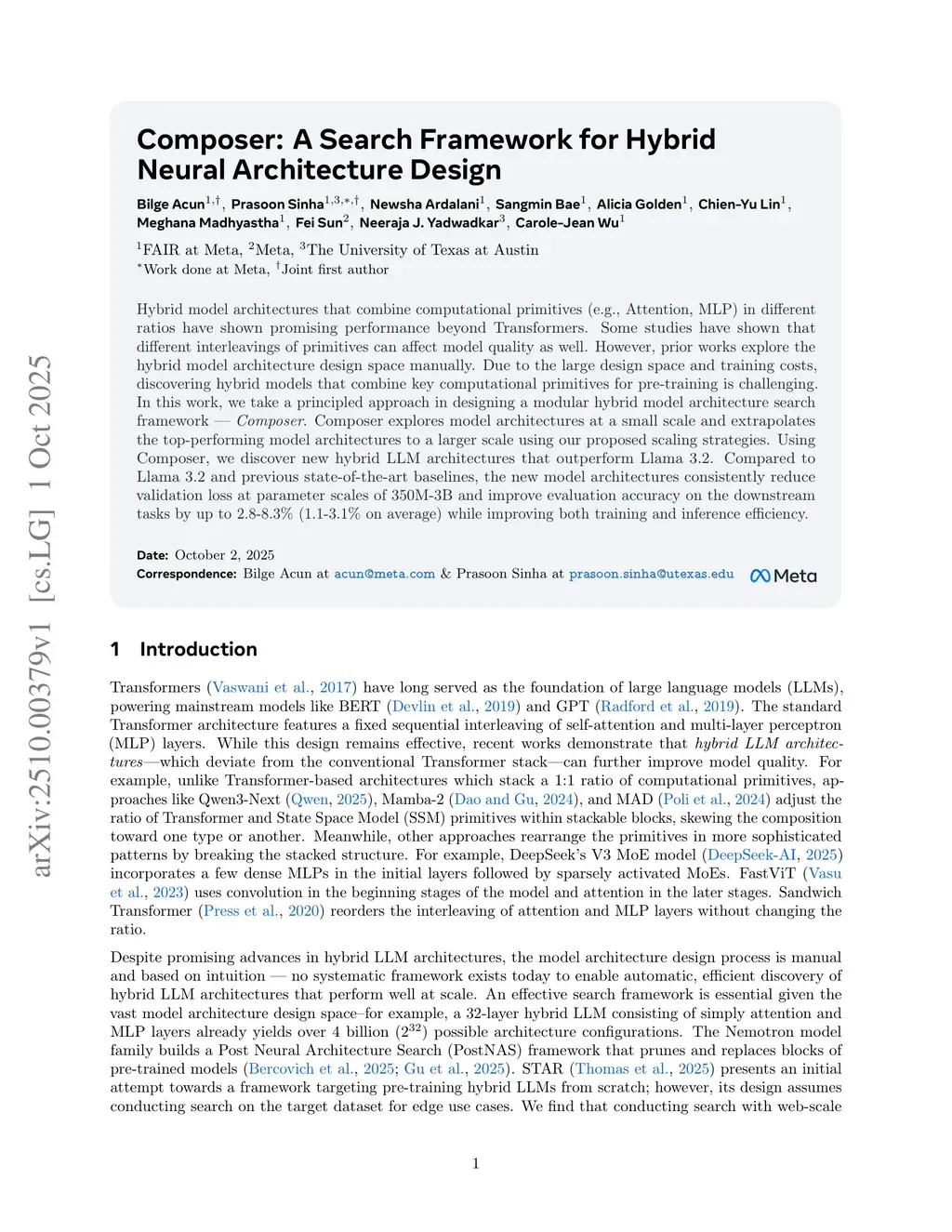Hybrid model architectures that combine computational primitives (e.g., Attention, MLP) in different ratios have shown promising performance beyond Transformers. Some studies have shown that different interleavings of primitives can affect model quality as well. However, prior works explore the hybrid model architecture design space manually. Due to the large design space and training costs, discovering hybrid models that combine key computational primitives for pre-training is challenging. In this work, we take a principled approach in designing a modular hybrid model architecture search framework -- Composer. Composer explores model architectures at a small scale and extrapolates the top-performing model architectures to a larger scale using our proposed scaling strategies. Using Composer, we discover new hybrid LLM architectures that outperform Llama 3.2. Compared to Llama 3.2 and previous state-of-the-art baselines, the new model architectures consistently reduce validation loss at parameter scales of 350M-3B and improve evaluation accuracy on the downstream tasks by up to 2.8-8.3% (1.1-3.1% on average) while improving both training and inference efficiency.