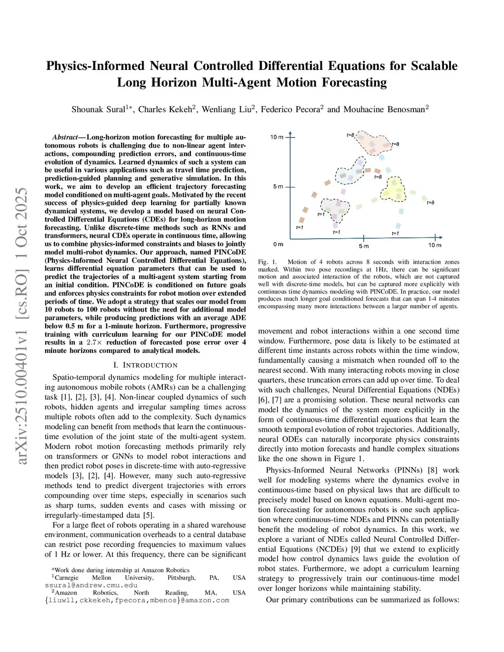 Long-horizon motion forecasting for multiple autonomous robots is challenging due to non-linear agent interactions, compounding prediction errors, and continuous-time evolution of dynamics. Learned dynamics of such a system can be useful in various applications such as travel time prediction, prediction-guided planning and generative simulation. In this work, we aim to develop an efficient trajectory forecasting model conditioned on multi-agent goals. Motivated by the recent success of physics-guided deep learning for partially known dynamical systems, we develop a model based on neural Controlled Differential Equations (CDEs) for long-horizon motion forecasting. Unlike discrete-time methods such as RNNs and transformers, neural CDEs operate in continuous time, allowing us to combine physics-informed constraints and biases to jointly model multi-robot dynamics. Our approach, named PINCoDE (Physics-Informed Neural Controlled Differential Equations), learns differential equation parameters that can be used to predict the trajectories of a multi-agent system starting from an initial condition. PINCoDE is conditioned on future goals and enforces physics constraints for robot motion over extended periods of time. We adopt a strategy that scales our model from 10 robots to 100 robots without the need for additional model parameters, while producing predictions with an average ADE below 0.5 m for a 1-minute horizon. Furthermore, progressive training with curriculum learning for our PINCoDE model results in a 2.7X reduction of forecasted pose error over 4 minute horizons compared to analytical models.