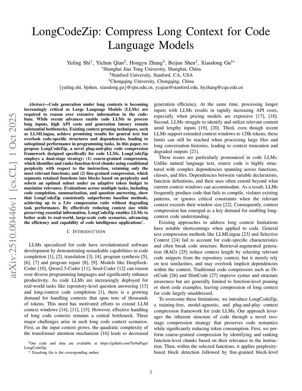Code generation under long contexts is becoming increasingly critical as Large Language Models (LLMs) are required to reason over extensive information in the codebase. While recent advances enable code LLMs to process long inputs, high API costs and generation latency remain substantial bottlenecks. Existing context pruning techniques, such as LLMLingua, achieve promising results for general text but overlook code-specific structures and dependencies, leading to suboptimal performance in programming tasks. In this paper, we propose LongCodeZip, a novel plug-and-play code compression framework designed specifically for code LLMs. LongCodeZip employs a dual-stage strategy: (1) coarse-grained compression, which identifies and ranks function-level chunks using conditional perplexity with respect to the instruction, retaining only the most relevant functions; and (2) fine-grained compression, which segments retained functions into blocks based on perplexity and selects an optimal subset under an adaptive token budget to maximize relevance. Evaluations across multiple tasks, including code completion, summarization, and question answering, show that LongCodeZip consistently outperforms baseline methods, achieving up to a 5.6x compression ratio without degrading task performance. By effectively reducing context size while preserving essential information, LongCodeZip enables LLMs to better scale to real-world, large-scale code scenarios, advancing the efficiency and capability of code intelligence applications.