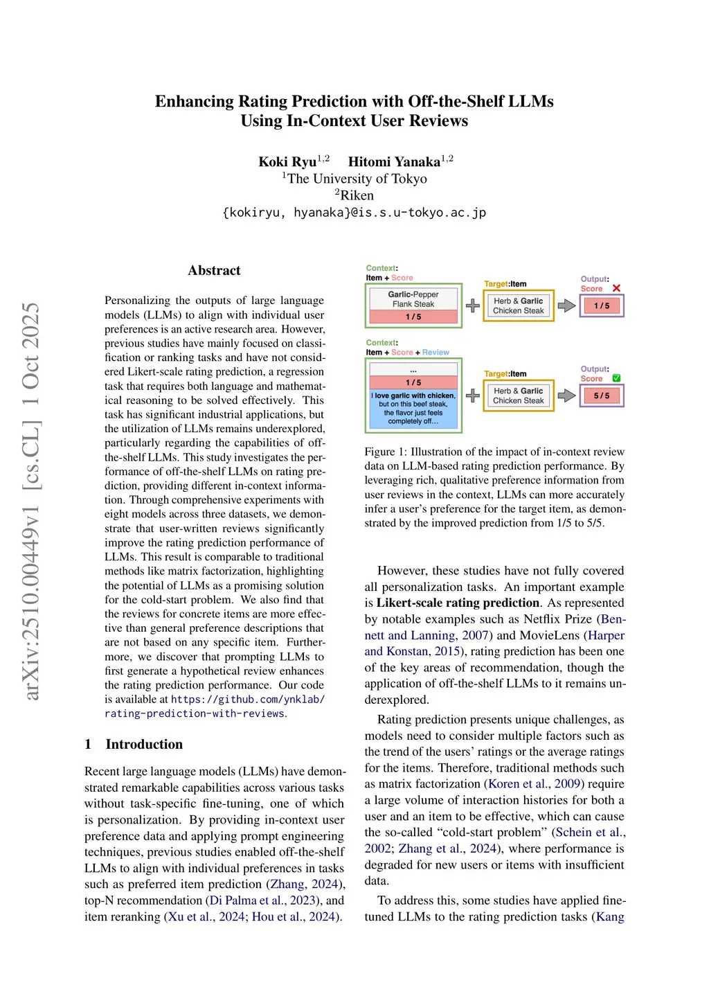 Personalizing the outputs of large language models (LLMs) to align with individual user preferences is an active research area. However, previous studies have mainly focused on classification or ranking tasks and have not considered Likert-scale rating prediction, a regression task that requires both language and mathematical reasoning to be solved effectively. This task has significant industrial applications, but the utilization of LLMs remains underexplored, particularly regarding the capabilities of off-the-shelf LLMs. This study investigates the performance of off-the-shelf LLMs on rating prediction, providing different in-context information. Through comprehensive experiments with eight models across three datasets, we demonstrate that user-written reviews significantly improve the rating prediction performance of LLMs. This result is comparable to traditional methods like matrix factorization, highlighting the potential of LLMs as a promising solution for the cold-start problem. We also find that the reviews for concrete items are more effective than general preference descriptions that are not based on any specific item. Furthermore, we discover that prompting LLMs to first generate a hypothetical review enhances the rating prediction performance. Our code is available atthis https URL.