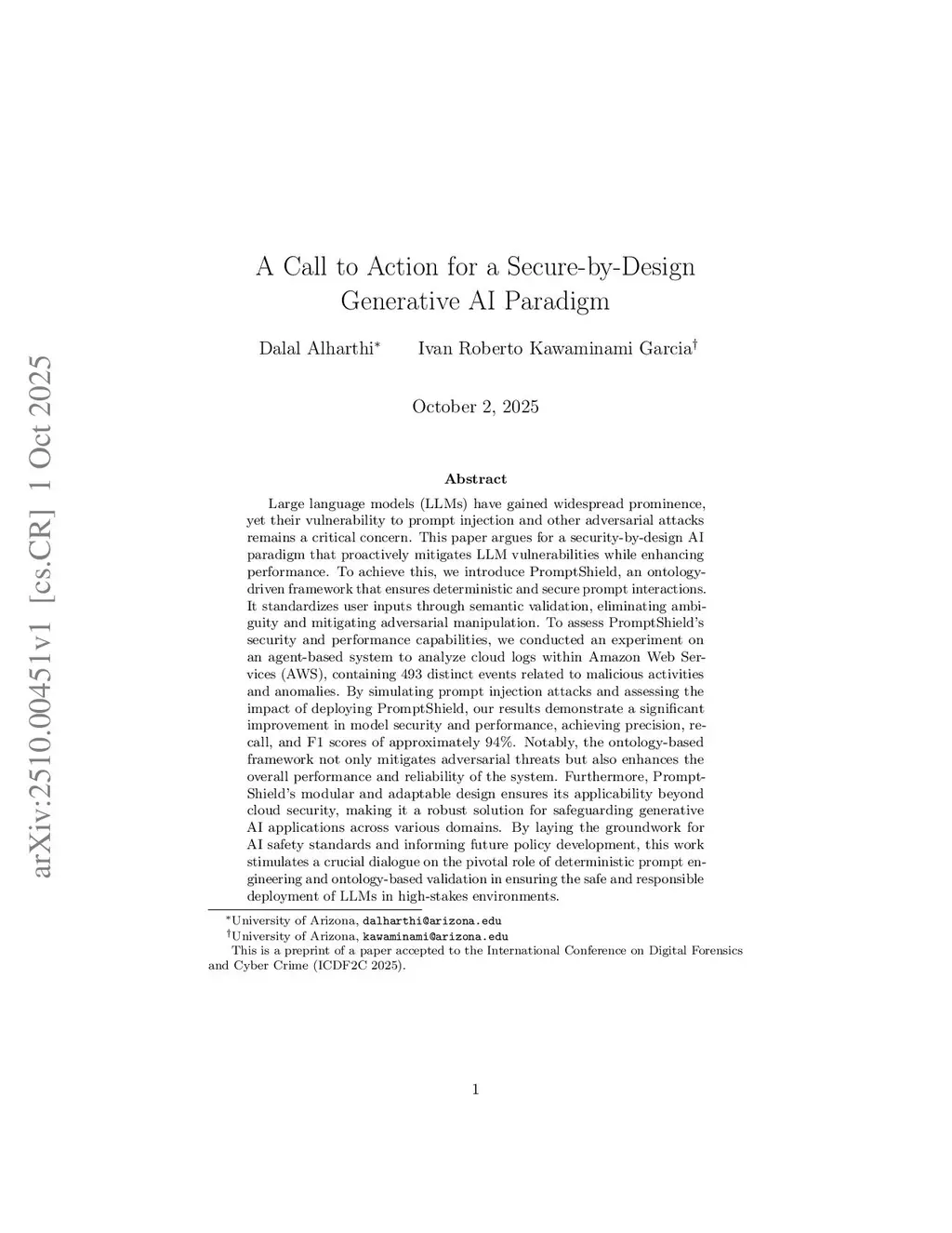 Large language models have gained widespread prominence, yet their vulnerability to prompt injection and other adversarial attacks remains a critical concern. This paper argues for a security-by-design AI paradigm that proactively mitigates LLM vulnerabilities while enhancing performance. To achieve this, we introduce PromptShield, an ontology-driven framework that ensures deterministic and secure prompt interactions. It standardizes user inputs through semantic validation, eliminating ambiguity and mitigating adversarial manipulation. To assess PromptShield's security and performance capabilities, we conducted an experiment on an agent-based system to analyze cloud logs within Amazon Web Services (AWS), containing 493 distinct events related to malicious activities and anomalies. By simulating prompt injection attacks and assessing the impact of deploying PromptShield, our results demonstrate a significant improvement in model security and performance, achieving precision, recall, and F1 scores of approximately 94%. Notably, the ontology-based framework not only mitigates adversarial threats but also enhances the overall performance and reliability of the system. Furthermore, PromptShield's modular and adaptable design ensures its applicability beyond cloud security, making it a robust solution for safeguarding generative AI applications across various domains. By laying the groundwork for AI safety standards and informing future policy development, this work stimulates a crucial dialogue on the pivotal role of deterministic prompt engineering and ontology-based validation in ensuring the safe and responsible deployment of LLMs in high-stakes environments.