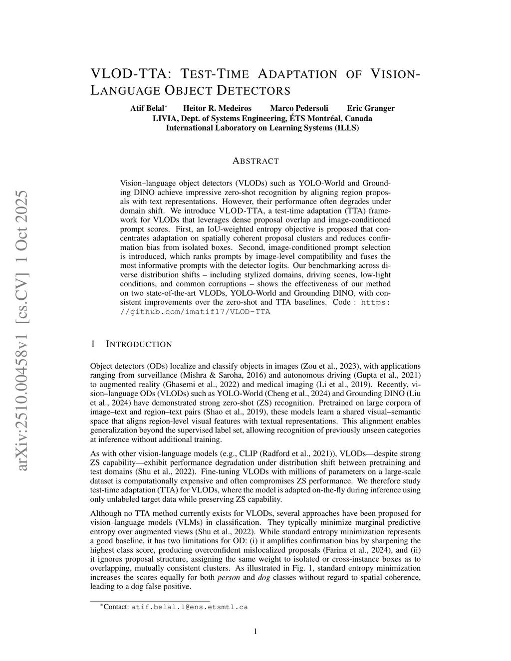 Vision-language object detectors (VLODs) such as YOLO-World and Grounding DINO exhibit strong zero-shot generalization, but their performance degrades under distribution shift. Test-time adaptation (TTA) offers a practical way to adapt models online using only unlabeled target data. However, despite substantial progress in TTA for vision-language classification, TTA for VLODs remains largely unexplored. The only prior method relies on a mean-teacher framework that introduces significant latency and memory overhead. To this end, we introduce \textsc{VLOD-TTA}, a TTA method that leverages dense proposal overlap and image-conditioned prompts to adapt VLODs with low additional overhead. \textsc{VLOD-TTA} combines (i) an IoU-weighted entropy objective that emphasizes spatially coherent proposal clusters and mitigates confirmation bias from isolated boxes, and (ii) image-conditioned prompt selection that ranks prompts by image-level compatibility and aggregates the most informative prompt scores for detection. Our experiments across diverse distribution shifts, including artistic domains, adverse driving conditions, low-light imagery, and common corruptions, indicate that \textsc{VLOD-TTA} consistently outperforms standard TTA baselines and the prior state-of-the-art method using YOLO-World and Grounding DINO. Code :this https URL