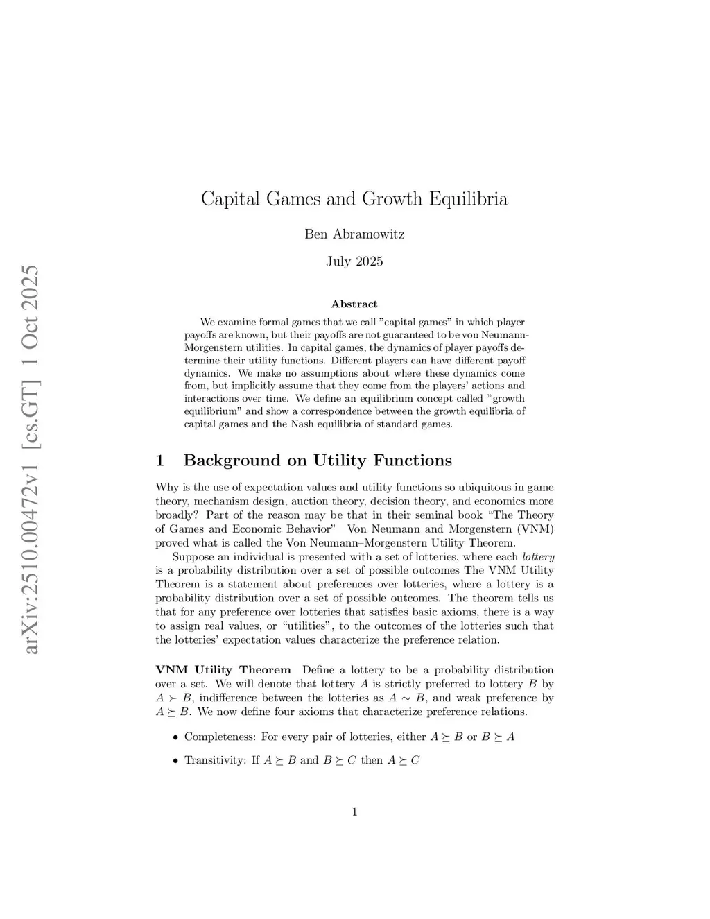 We introduce capital games, which generalize the definition of standard games to incorporate dynamics. In capital games, payoffs are in units of capital which are not assumed to be units of utility. The dynamics allow us to infer player utilities from their individual payoffs and linearizable capital dynamics under the assumption that players aim to maximize the time-average growth rate of their capital.