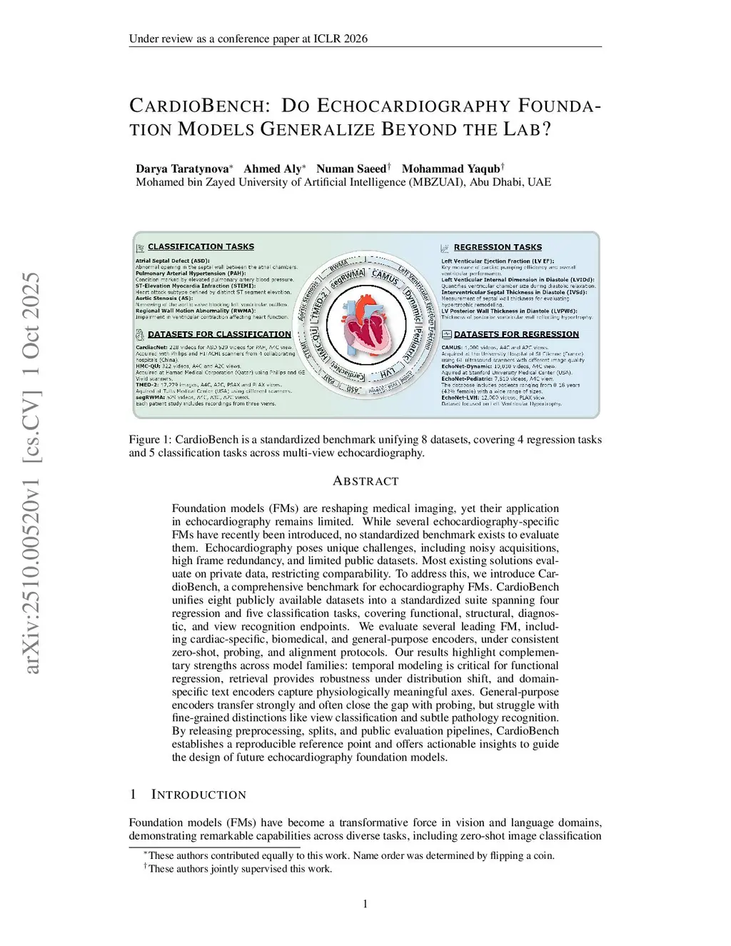 Foundation models (FMs) are reshaping medical imaging, yet their application in echocardiography remains limited. While several echocardiography-specific FMs have recently been introduced, no standardized benchmark exists to evaluate them. Echocardiography poses unique challenges, including noisy acquisitions, high frame redundancy, and limited public datasets. Most existing solutions evaluate on private data, restricting comparability. To address this, we introduce CardioBench, a comprehensive benchmark for echocardiography FMs. CardioBench unifies eight publicly available datasets into a standardized suite spanning four regression and five classification tasks, covering functional, structural, diagnostic, and view recognition endpoints. We evaluate several leading FM, including cardiac-specific, biomedical, and general-purpose encoders, under consistent zero-shot, probing, and alignment protocols. Our results highlight complementary strengths across model families: temporal modeling is critical for functional regression, retrieval provides robustness under distribution shift, and domain-specific text encoders capture physiologically meaningful axes. General-purpose encoders transfer strongly and often close the gap with probing, but struggle with fine-grained distinctions like view classification and subtle pathology recognition. By releasing preprocessing, splits, and public evaluation pipelines, CardioBench establishes a reproducible reference point and offers actionable insights to guide the design of future echocardiography foundation models.