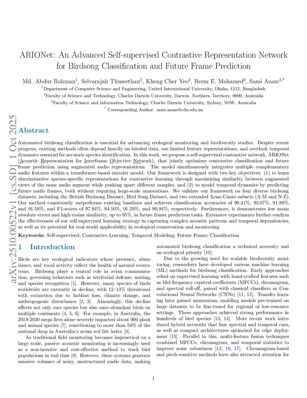 ARIONet: An Advanced Self-supervised Contrastive Representation Network for Birdsong Classification and Future Frame Prediction