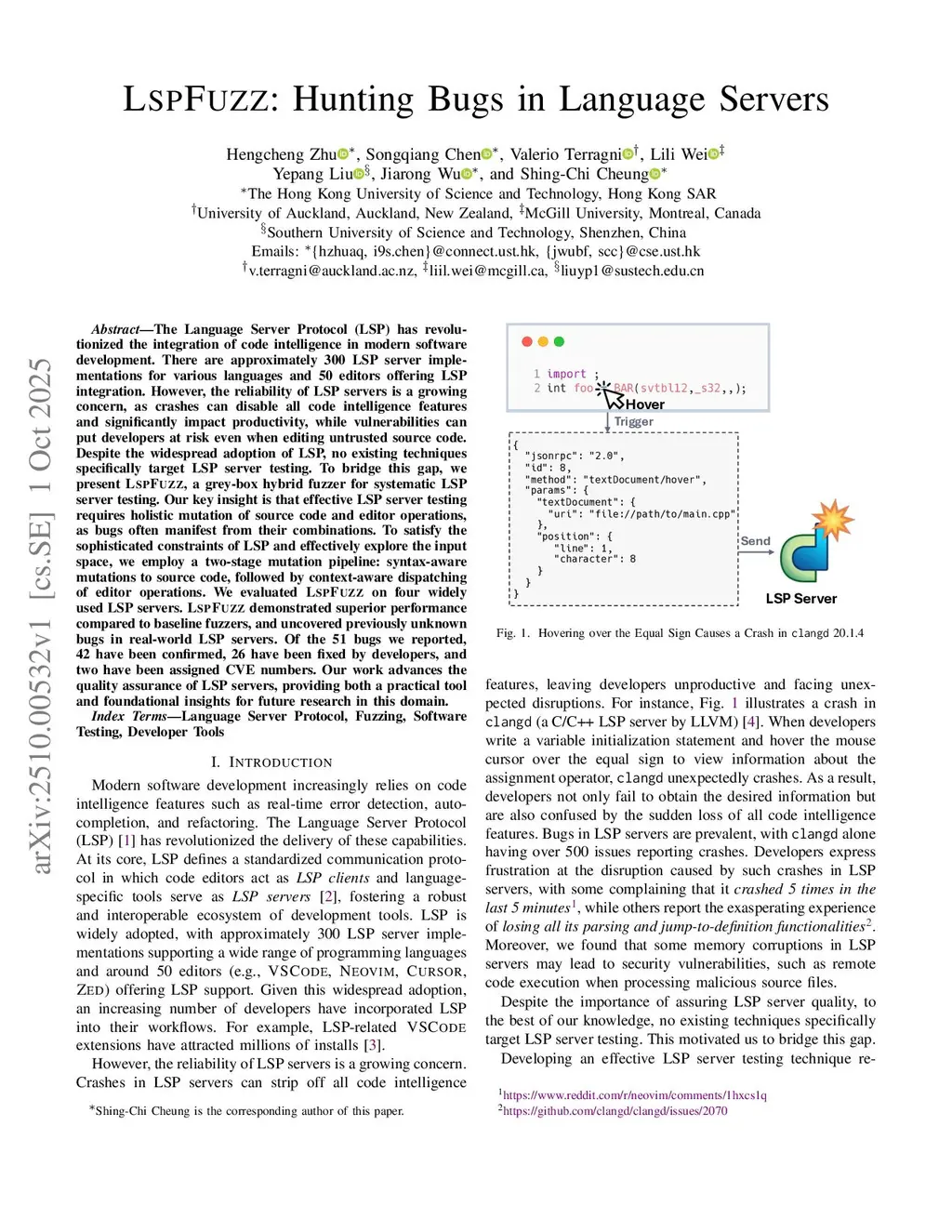 The Language Server Protocol (LSP) has revolutionized the integration of code intelligence in modern software development. There are approximately 300 LSP server implementations for various languages and 50 editors offering LSP integration. However, the reliability of LSP servers is a growing concern, as crashes can disable all code intelligence features and significantly impact productivity, while vulnerabilities can put developers at risk even when editing untrusted source code. Despite the widespread adoption of LSP, no existing techniques specifically target LSP server testing. To bridge this gap, we present LSPFuzz, a grey-box hybrid fuzzer for systematic LSP server testing. Our key insight is that effective LSP server testing requires holistic mutation of source code and editor operations, as bugs often manifest from their combinations. To satisfy the sophisticated constraints of LSP and effectively explore the input space, we employ a two-stage mutation pipeline: syntax-aware mutations to source code, followed by context-aware dispatching of editor operations. We evaluated LSPFuzz on four widely used LSP servers. LSPFuzz demonstrated superior performance compared to baseline fuzzers, and uncovered previously unknown bugs in real-world LSP servers. Of the 51 bugs we reported, 42 have been confirmed, 26 have been fixed by developers, and two have been assigned CVE numbers. Our work advances the quality assurance of LSP servers, providing both a practical tool and foundational insights for future research in this domain.