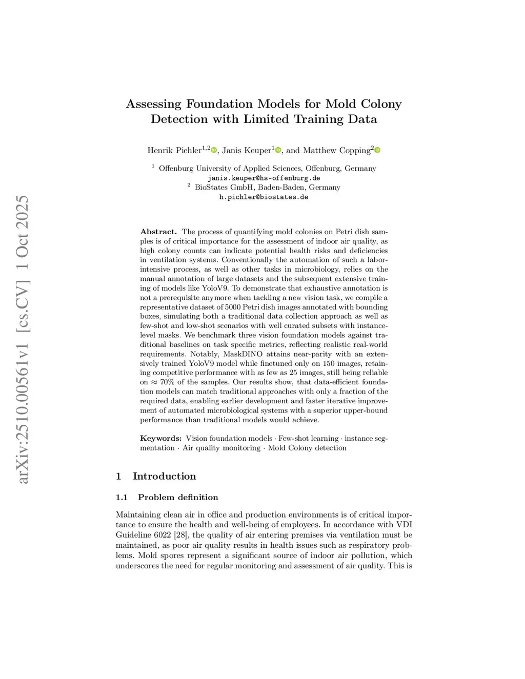 The process of quantifying mold colonies on Petri dish samples is of critical importance for the assessment of indoor air quality, as high colony counts can indicate potential health risks and deficiencies in ventilation systems. Conventionally the automation of such a labor-intensive process, as well as other tasks in microbiology, relies on the manual annotation of large datasets and the subsequent extensive training of models like YoloV9. To demonstrate that exhaustive annotation is not a prerequisite anymore when tackling a new vision task, we compile a representative dataset of 5000 Petri dish images annotated with bounding boxes, simulating both a traditional data collection approach as well as few-shot and low-shot scenarios with well curated subsets with instance level masks. We benchmark three vision foundation models against traditional baselines on task specific metrics, reflecting realistic real-world requirements. Notably, MaskDINO attains near-parity with an extensively trained YoloV9 model while finetuned only on 150 images, retaining competitive performance with as few as 25 images, still being reliable on 70% of the samples. Our results show that data-efficient foundation models can match traditional approaches with only a fraction of the required data, enabling earlier development and faster iterative improvement of automated microbiological systems with a superior upper-bound performance than traditional models would achieve.
