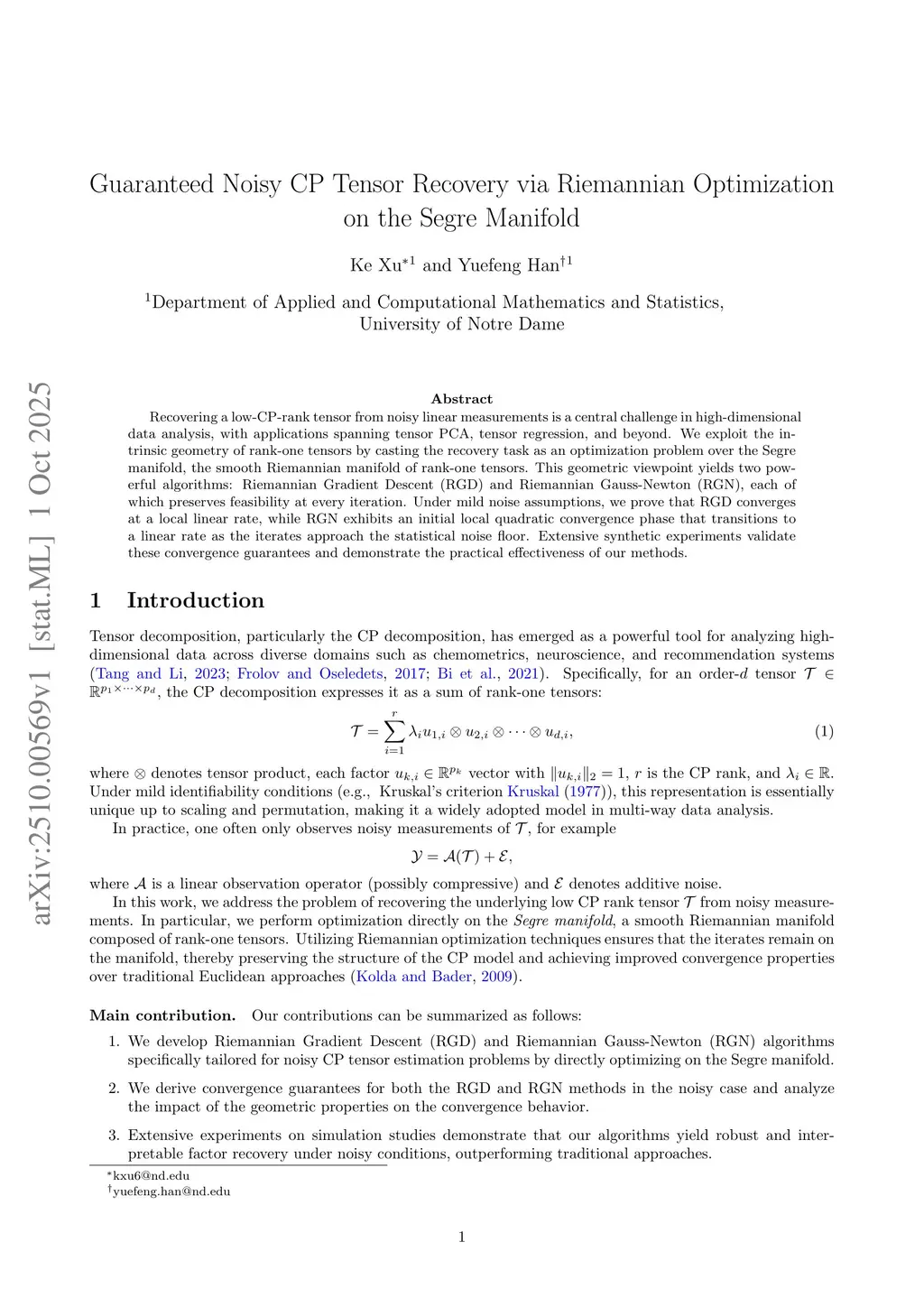 Recovering a low-CP-rank tensor from noisy linear measurements is a central challenge in high-dimensional data analysis, with applications spanning tensor PCA, tensor regression, and beyond. We exploit the intrinsic geometry of rank-one tensors by casting the recovery task as an optimization problem over the Segre manifold, the smooth Riemannian manifold of rank-one tensors. This geometric viewpoint yields two powerful algorithms: Riemannian Gradient Descent (RGD) and Riemannian Gauss-Newton (RGN), each of which preserves feasibility at every iteration. Under mild noise assumptions, we prove that RGD converges at a local linear rate, while RGN exhibits an initial local quadratic convergence phase that transitions to a linear rate as the iterates approach the statistical noise floor. Extensive synthetic experiments validate these convergence guarantees and demonstrate the practical effectiveness of our methods.