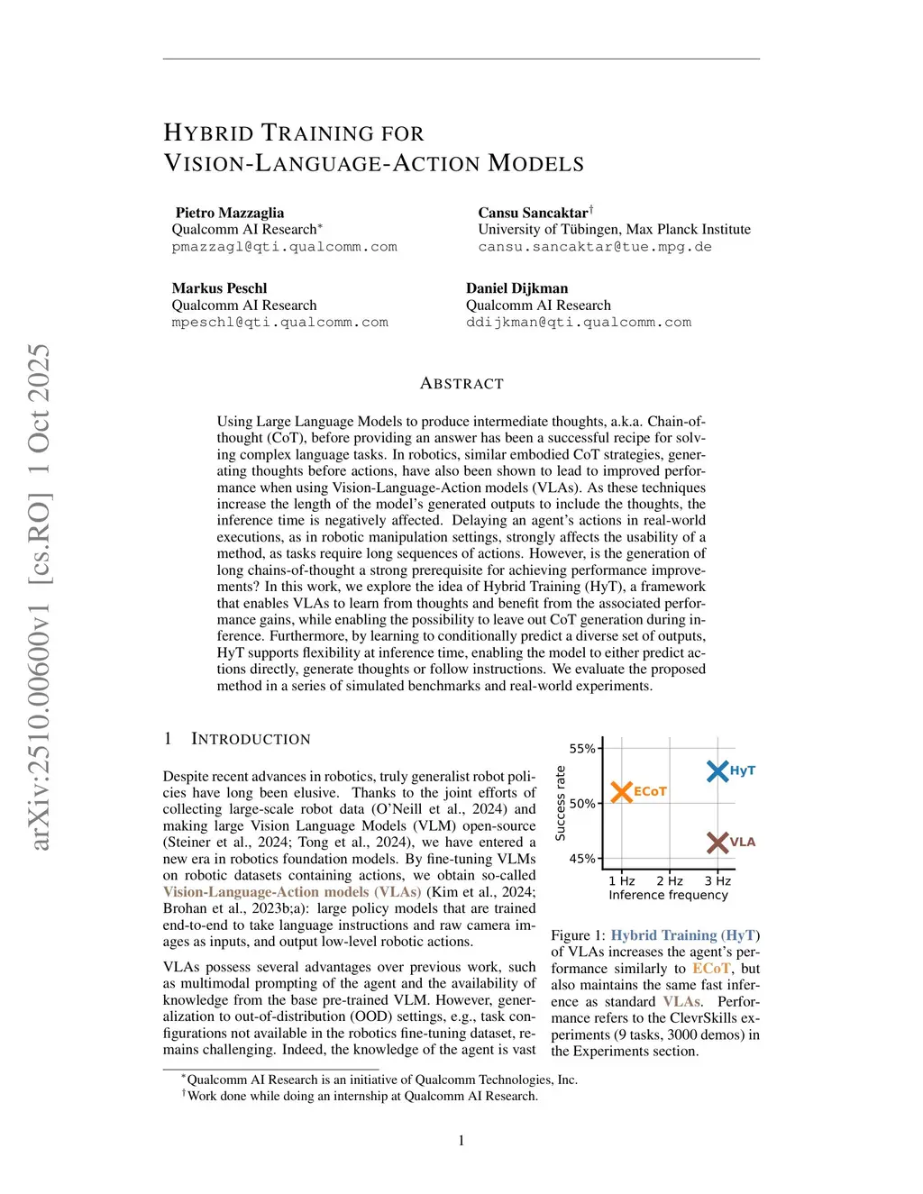 Using Large Language Models to produce intermediate thoughts, a.k.a. Chain-of-thought (CoT), before providing an answer has been a successful recipe for solving complex language tasks. In robotics, similar embodied CoT strategies, generating thoughts before actions, have also been shown to lead to improved performance when using Vision-Language-Action models (VLAs). As these techniques increase the length of the model's generated outputs to include the thoughts, the inference time is negatively affected. Delaying an agent's actions in real-world executions, as in robotic manipulation settings, strongly affects the usability of a method, as tasks require long sequences of actions. However, is the generation of long chains-of-thought a strong prerequisite for achieving performance improvements? In this work, we explore the idea of Hybrid Training (HyT), a framework that enables VLAs to learn from thoughts and benefit from the associated performance gains, while enabling the possibility to leave out CoT generation during inference. Furthermore, by learning to conditionally predict a diverse set of outputs, HyT supports flexibility at inference time, enabling the model to either predict actions directly, generate thoughts or follow instructions. We evaluate the proposed method in a series of simulated benchmarks and real-world experiments.