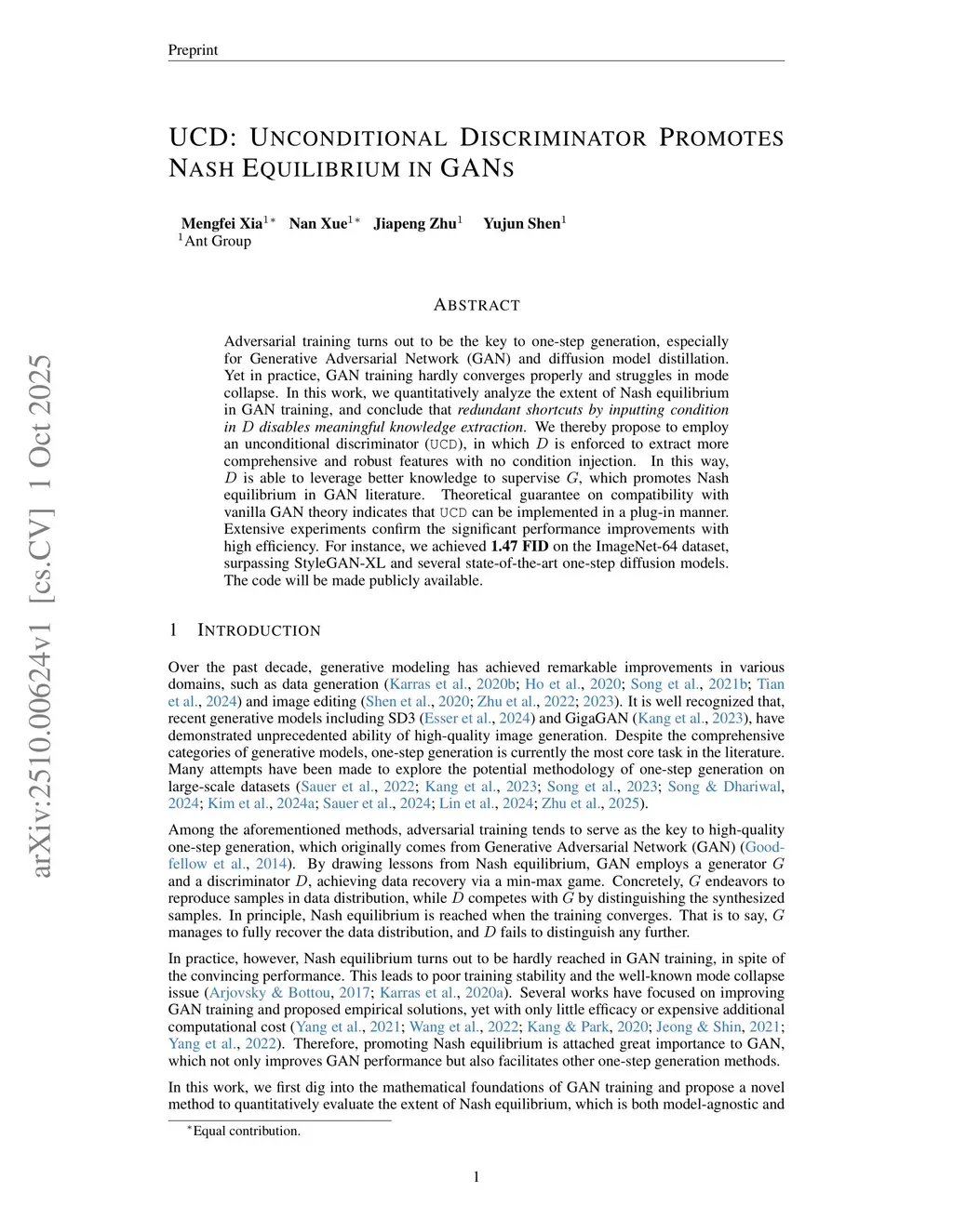 Adversarial training turns out to be the key to one-step generation, especially for Generative Adversarial Network (GAN) and diffusion model distillation. Yet in practice, GAN training hardly converges properly and struggles in mode collapse. In this work, we quantitatively analyze the extent of Nash equilibrium in GAN training, and conclude that redundant shortcuts by inputting condition in disables meaningful knowledge extraction. We thereby propose to employ an unconditional discriminator (UCD), in which is enforced to extract more comprehensive and robust features with no condition injection. In this way, is able to leverage better knowledge to supervise , which promotes Nash equilibrium in GAN literature. Theoretical guarantee on compatibility with vanilla GAN theory indicates that UCD can be implemented in a plug-in manner. Extensive experiments confirm the significant performance improvements with high efficiency. For instance, we achieved \textbf{1.47 FID} on the ImageNet-64 dataset, surpassing StyleGAN-XL and several state-of-the-art one-step diffusion models. The code will be made publicly available.