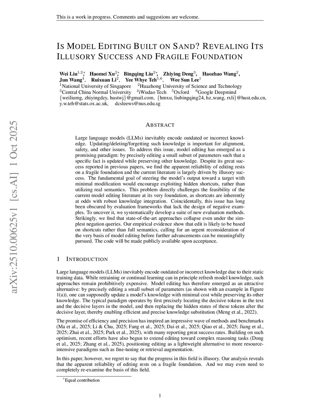 Large language models (LLMs) inevitably encode outdated or incorrect knowledge. Updating, deleting, and forgetting such knowledge is important for alignment, safety, and other issues. To address this issue, model editing has emerged as a promising paradigm: by precisely editing a small subset of parameters such that a specific fact is updated while preserving other knowledge. Despite its great success reported in previous papers, we find the apparent reliability of editing rests on a fragile foundation and the current literature is largely driven by illusory success. The fundamental goal of steering the model's output toward a target with minimal modification would encourage exploiting hidden shortcuts, rather than utilizing real semantics. This problem directly challenges the feasibility of the current model editing literature at its very foundation, as shortcuts are inherently at odds with robust knowledge integration. Coincidentally, this issue has long been obscured by evaluation frameworks that lack the design of negative examples. To uncover it, we systematically develop a suite of new evaluation methods. Strikingly, we find that state-of-the-art approaches collapse even under the simplest negation queries. Our empirical evidence shows that editing is likely to be based on shortcuts rather than full semantics, calling for an urgent reconsideration of the very basis of model editing before further advancements can be meaningfully pursued.