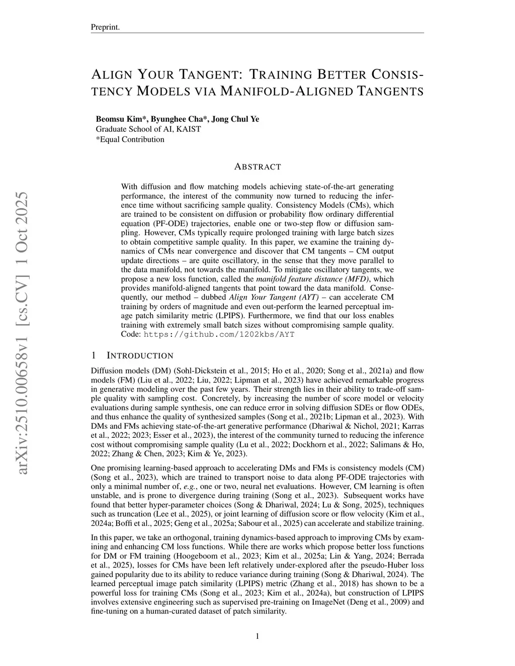 With diffusion and flow matching models achieving state-of-the-art generating performance, the interest of the community now turned to reducing the inference time without sacrificing sample quality. Consistency Models (CMs), which are trained to be consistent on diffusion or probability flow ordinary differential equation (PF-ODE) trajectories, enable one or two-step flow or diffusion sampling. However, CMs typically require prolonged training with large batch sizes to obtain competitive sample quality. In this paper, we examine the training dynamics of CMs near convergence and discover that CM tangents -- CM output update directions -- are quite oscillatory, in the sense that they move parallel to the data manifold, not towards the manifold. To mitigate oscillatory tangents, we propose a new loss function, called the manifold feature distance (MFD), which provides manifold-aligned tangents that point toward the data manifold. Consequently, our method -- dubbed Align Your Tangent (AYT) -- can accelerate CM training by orders of magnitude and even out-perform the learned perceptual image patch similarity metric (LPIPS). Furthermore, we find that our loss enables training with extremely small batch sizes without compromising sample quality. Code:this https URL