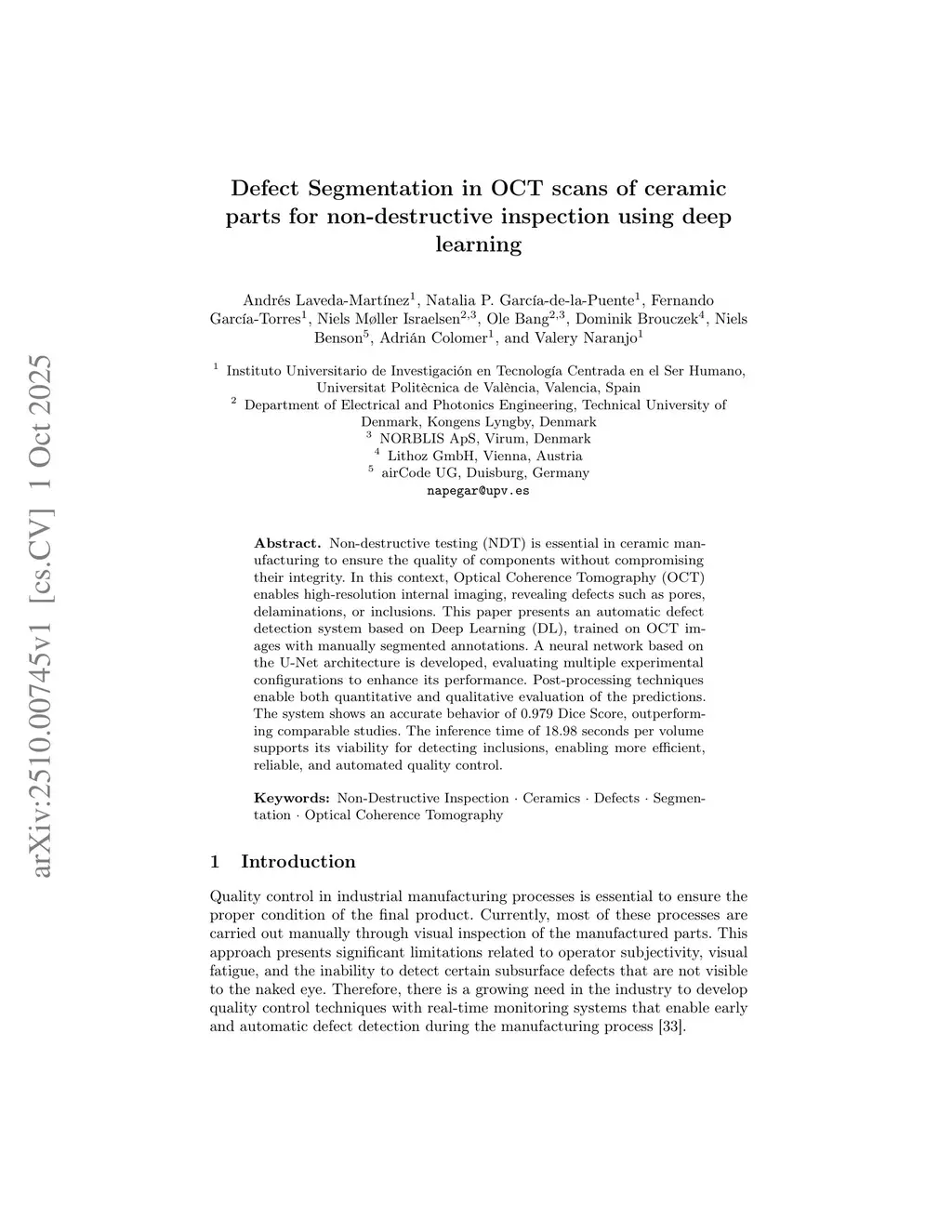 Defect Segmentation in OCT scans of ceramic parts for non-destructive inspection using deep learning