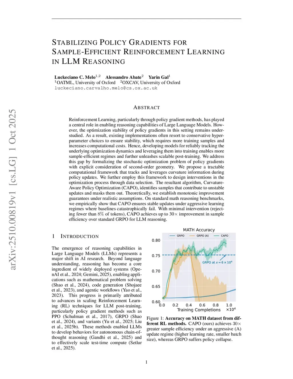 Reinforcement Learning, particularly through policy gradient methods, has played a central role in enabling reasoning capabilities of Large Language Models. However, the optimization stability of policy gradients in this setting remains understudied. As a result, existing implementations often resort to conservative hyperparameter choices to ensure stability, which requires more training samples and increases computational costs. Hence, developing models for reliably tracking the underlying optimization dynamics and leveraging them into training enables more sample-efficient regimes and further unleashes scalable post-training. We address this gap by formalizing the stochastic optimization problem of policy gradients with explicit consideration of second-order geometry. We propose a tractable computational framework that tracks and leverages curvature information during policy updates. We further employ this framework to design interventions in the optimization process through data selection. The resultant algorithm, Curvature-Aware Policy Optimization (CAPO), identifies samples that contribute to unstable updates and masks them out. Theoretically, we establish monotonic improvement guarantees under realistic assumptions. On standard math reasoning benchmarks, we empirically show that CAPO ensures stable updates under aggressive learning regimes where baselines catastrophically fail. With minimal intervention (rejecting fewer than 8% of tokens), CAPO achieves up to 30x improvement in sample efficiency over standard GRPO for LLM reasoning.