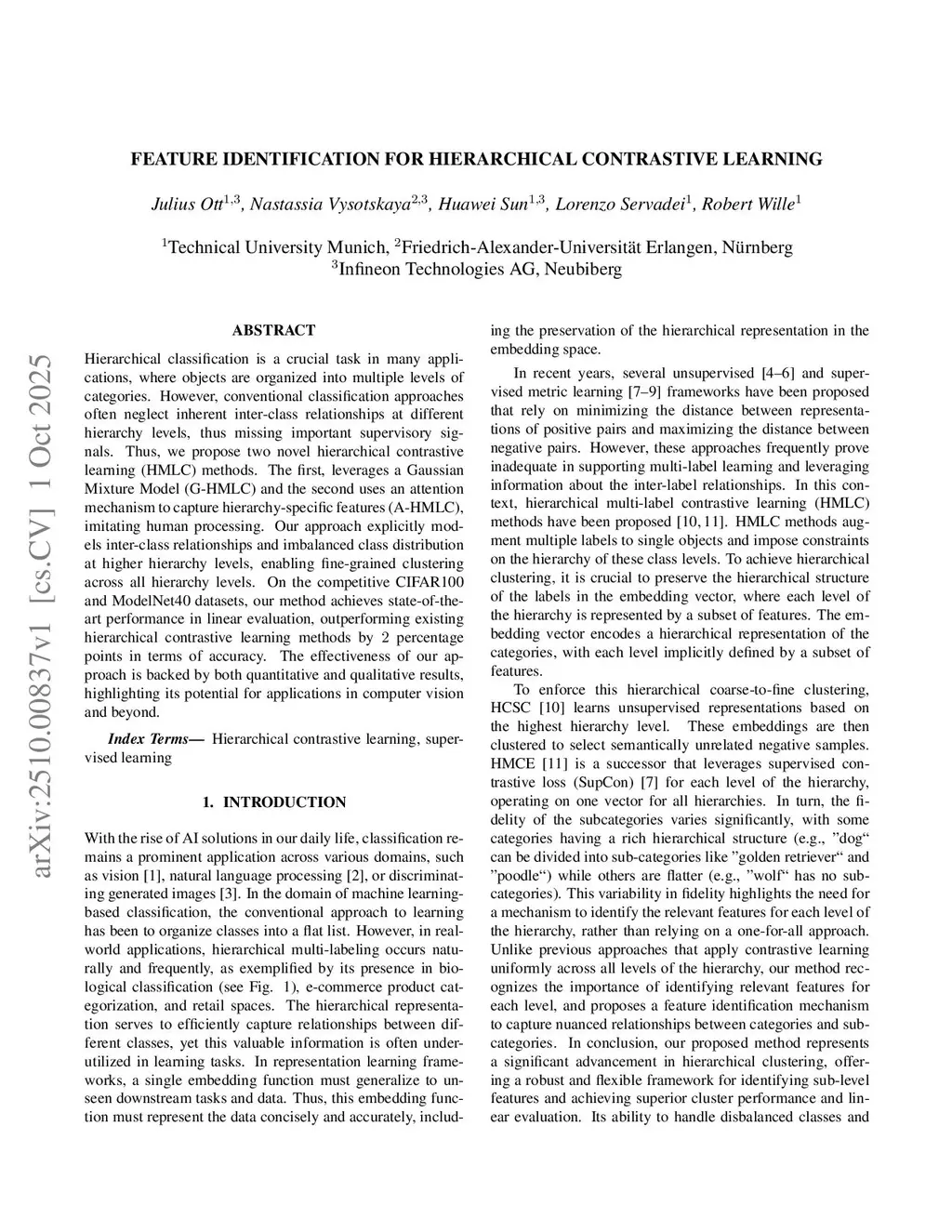 Hierarchical classification is a crucial task in many applications, where objects are organized into multiple levels of categories. However, conventional classification approaches often neglect inherent inter-class relationships at different hierarchy levels, thus missing important supervisory signals. Thus, we propose two novel hierarchical contrastive learning (HMLC) methods. The first, leverages a Gaussian Mixture Model (G-HMLC) and the second uses an attention mechanism to capture hierarchy-specific features (A-HMLC), imitating human processing. Our approach explicitly models inter-class relationships and imbalanced class distribution at higher hierarchy levels, enabling fine-grained clustering across all hierarchy levels. On the competitive CIFAR100 and ModelNet40 datasets, our method achieves state-of-the-art performance in linear evaluation, outperforming existing hierarchical contrastive learning methods by 2 percentage points in terms of accuracy. The effectiveness of our approach is backed by both quantitative and qualitative results, highlighting its potential for applications in computer vision and beyond.