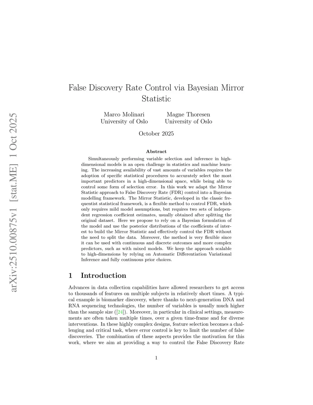 Simultaneously performing variable selection and inference in high-dimensional models is an open challenge in statistics and machine learning. The increasing availability of vast amounts of variables requires the adoption of specific statistical procedures to accurately select the most important predictors in a high-dimensional space, while being able to control some form of selection error. In this work we adapt the Mirror Statistic approach to False Discovery Rate (FDR) control into a Bayesian modelling framework. The Mirror Statistic, developed in the classic frequentist statistical framework, is a flexible method to control FDR, which only requires mild model assumptions, but requires two sets of independent regression coefficient estimates, usually obtained after splitting the original dataset. Here we propose to rely on a Bayesian formulation of the model and use the posterior distributions of the coefficients of interest to build the Mirror Statistic and effectively control the FDR without the need to split the data. Moreover, the method is very flexible since it can be used with continuous and discrete outcomes and more complex predictors, such as with mixed models. We keep the approach scalable to high-dimensions by relying on Automatic Differentiation Variational Inference and fully continuous prior choices.