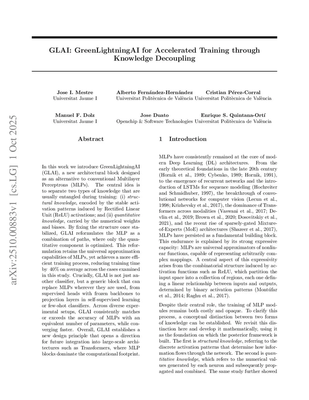 In this work we introduce GreenLightningAI (GLAI), a new architectural block designed as an alternative to conventional MLPs. The central idea is to separate two types of knowledge that are usually entangled during training: (i) *structural knowledge*, encoded by the stable activation patterns induced by ReLU activations; and (ii) *quantitative knowledge*, carried by the numerical weights and biases. By fixing the structure once stabilized, GLAI reformulates the MLP as a combination of paths, where only the quantitative component is optimized. This reformulation retains the universal approximation capabilities of MLPs, yet achieves a more efficient training process, reducing training time by ~40% on average across the cases examined in this study. Crucially, GLAI is not just another classifier, but a generic block that can replace MLPs wherever they are used, from supervised heads with frozen backbones to projection layers in self-supervised learning or few-shot classifiers. Across diverse experimental setups, GLAI consistently matches or exceeds the accuracy of MLPs with an equivalent number of parameters, while converging faster. Overall, GLAI establishes a new design principle that opens a direction for future integration into large-scale architectures such as Transformers, where MLP blocks dominate the computational footprint.