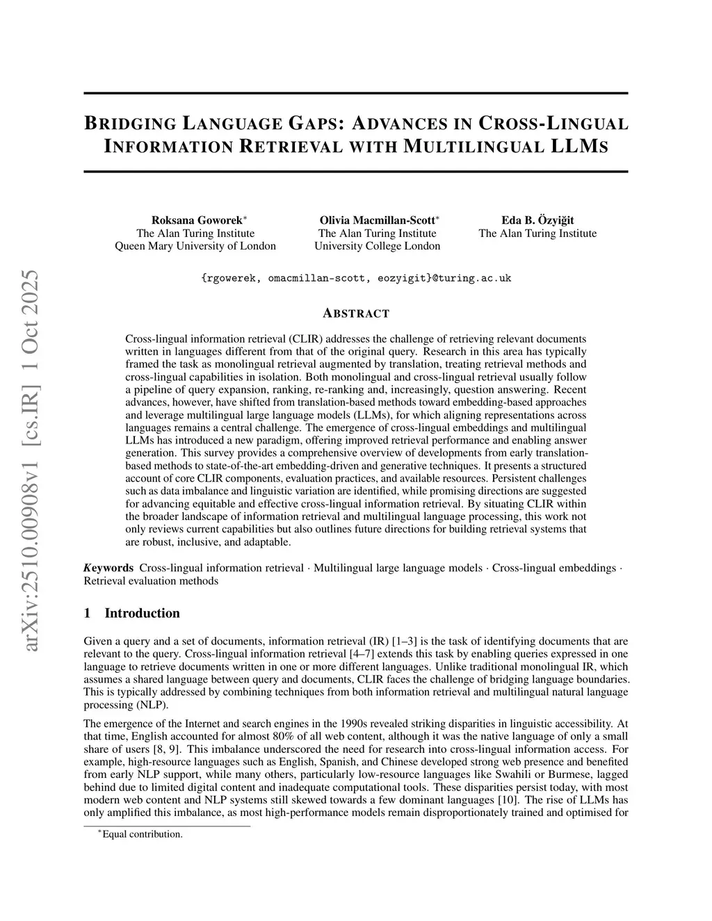 Cross-lingual information retrieval (CLIR) addresses the challenge of retrieving relevant documents written in languages different from that of the original query. Research in this area has typically framed the task as monolingual retrieval augmented by translation, treating retrieval methods and cross-lingual capabilities in isolation. Both monolingual and cross-lingual retrieval usually follow a pipeline of query expansion, ranking, re-ranking and, increasingly, question answering. Recent advances, however, have shifted from translation-based methods toward embedding-based approaches and leverage multilingual large language models (LLMs), for which aligning representations across languages remains a central challenge. The emergence of cross-lingual embeddings and multilingual LLMs has introduced a new paradigm, offering improved retrieval performance and enabling answer generation. This survey provides a comprehensive overview of developments from early translation-based methods to state-of-the-art embedding-driven and generative techniques. It presents a structured account of core CLIR components, evaluation practices, and available resources. Persistent challenges such as data imbalance and linguistic variation are identified, while promising directions are suggested for advancing equitable and effective cross-lingual information retrieval. By situating CLIR within the broader landscape of information retrieval and multilingual language processing, this work not only reviews current capabilities but also outlines future directions for building retrieval systems that are robust, inclusive, and adaptable.