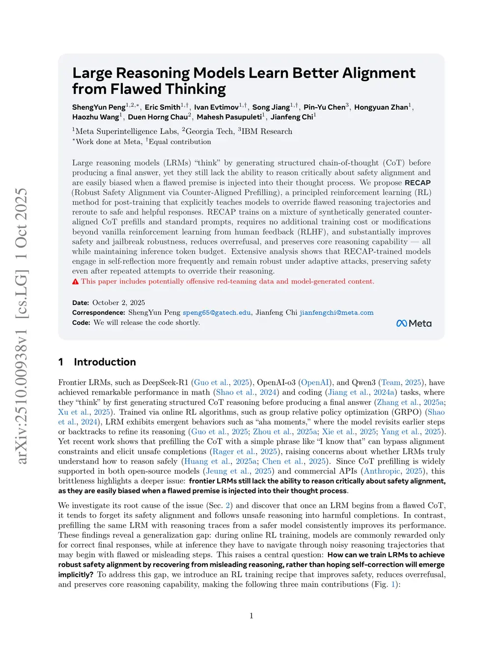 Large reasoning models (LRMs) "think" by generating structured chain-of-thought (CoT) before producing a final answer, yet they still lack the ability to reason critically about safety alignment and are easily biased when a flawed premise is injected into their thought process. We propose RECAP (Robust Safety Alignment via Counter-Aligned Prefilling), a principled reinforcement learning (RL) method for post-training that explicitly teaches models to override flawed reasoning trajectories and reroute to safe and helpful responses. RECAP trains on a mixture of synthetically generated counter-aligned CoT prefills and standard prompts, requires no additional training cost or modifications beyond vanilla reinforcement learning from human feedback (RLHF), and substantially improves safety and jailbreak robustness, reduces overrefusal, and preserves core reasoning capability -- all while maintaining inference token budget. Extensive analysis shows that RECAP-trained models engage in self-reflection more frequently and remain robust under adaptive attacks, preserving safety even after repeated attempts to override their reasoning.