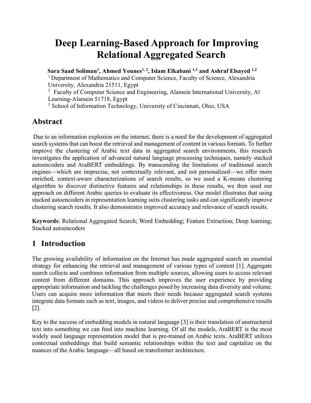 Due to an information explosion on the internet, there is a need for the development of aggregated search systems that can boost the retrieval and management of content in various formats. To further improve the clustering of Arabic text data in aggregated search environments, this research investigates the application of advanced natural language processing techniques, namely stacked autoencoders and AraBERT embeddings. By transcending the limitations of traditional search engines, which are imprecise, not contextually relevant, and not personalized, we offer more enriched, context-aware characterizations of search results, so we used a K-means clustering algorithm to discover distinctive features and relationships in these results, we then used our approach on different Arabic queries to evaluate its effectiveness. Our model illustrates that using stacked autoencoders in representation learning suits clustering tasks and can significantly improve clustering search results. It also demonstrates improved accuracy and relevance of search results.